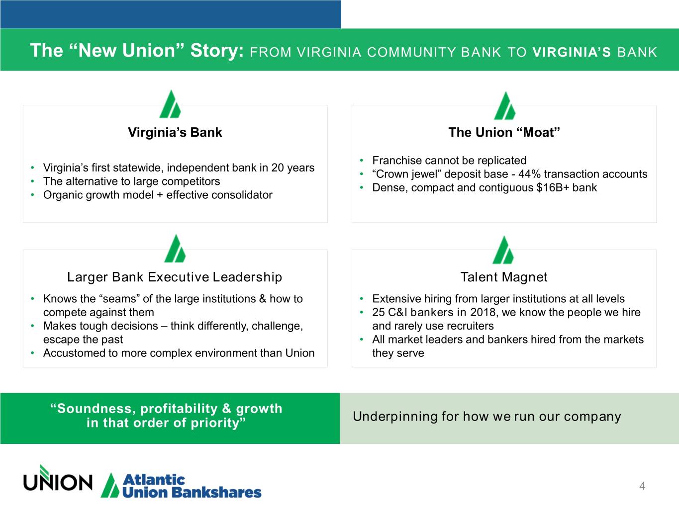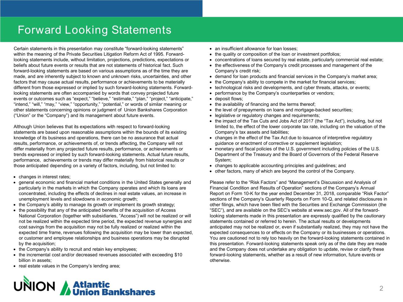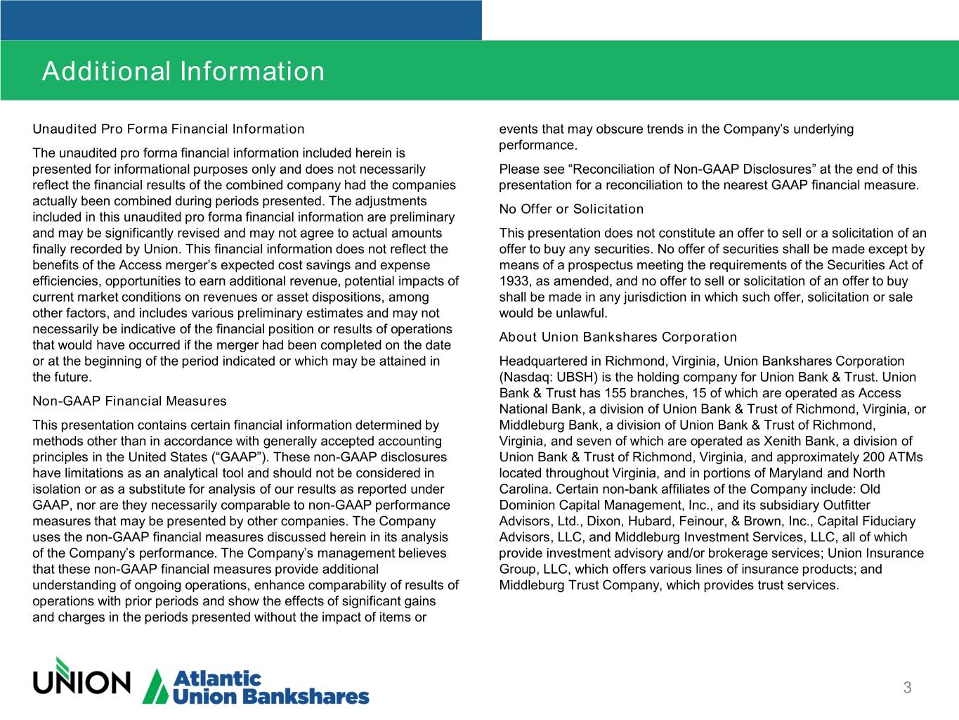 Forward Looking Statements Certain statements in this presentation may constitute “forward-looking statements” an insufficient allowance for loan losses; within the meaning of the Private Securities Litigation Reform Act of 1995. Forward- the quality or composition of the loan or investment portfolios; looking statements include, without limitation, projections, predictions, expectations or concentrations of loans secured by real estate, particularly commercial real estate; beliefs about future events or results that are not statements of historical fact. Such the effectiveness of the Company’s credit processes and management of the forward-looking statements are based on various assumptions as of the time they are Company’s credit risk; made, and are inherently subject to known and unknown risks, uncertainties, and other demand for loan products and financial services in the Company’s market area; factors that may cause actual results, performance or achievements to be materially the Company’s ability to compete in the market for financial services; different from those expressed or implied by such forward-looking statements. Forward- technological risks and developments, and cyber threats, attacks, or events; looking statements are often accompanied by words that convey projected future performance by the Company’s counterparties or vendors; events or outcomes such as “expect,” “believe,” “estimate,” “plan,” “project,” “anticipate,” deposit flows; “intend,” “will,” “may,” “view,” “opportunity,” “potential,” or words of similar meaning or the availability of financing and the terms thereof; other statements concerning opinions or judgment of Union Bankshares Corporation the level of prepayments on loans and mortgage-backed securities; (“Union” or the “Company”) and its management about future events. legislative or regulatory changes and requirements; the impact of the Tax Cuts and Jobs Act of 2017 (the “Tax Act”), including, but not Although Union believes that its expectations with respect to forward-looking limited to, the effect of the lower corporate tax rate, including on the valuation of the statements are based upon reasonable assumptions within the bounds of its existing Company’s tax assets and liabilities; knowledge of its business and operations, there can be no assurance that actual changes in the effect of the Tax Act due to issuance of interpretive regulatory results, performance, or achievements of, or trends affecting, the Company will not guidance or enactment of corrective or supplement legislation; differ materially from any projected future results, performance, or achievements or monetary and fiscal policies of the U.S. government including policies of the U.S. trends expressed or implied by such forward-looking statements. Actual future results, Department of the Treasury and the Board of Governors of the Federal Reserve performance, achievements or trends may differ materially from historical results or System; those anticipated depending on a variety of factors, including, but not limited to: changes to applicable accounting principles and guidelines; and other factors, many of which are beyond the control of the Company. changes in interest rates; general economic and financial market conditions in the United States generally and Please refer to the “Risk Factors” and “Management’s Discussion and Analysis of particularly in the markets in which the Company operates and which its loans are Financial Condition and Results of Operation” sections of the Company’s Annual concentrated, including the effects of declines in real estate values, an increase in Report on Form 10-K for the year ended December 31, 2018, comparable “Risk Factor” unemployment levels and slowdowns in economic growth; sections of the Company’s Quarterly Reports on Form 10-Q, and related disclosures in the Company’s ability to manage its growth or implement its growth strategy; other filings, which have been filed with the Securities and Exchange Commission (the the possibility that any of the anticipated benefits of the acquisition of Access “SEC”), and are available on the SEC’s website at www.sec.gov. All of the forward- National Corporation (together with subsidiaries, “Access”) will not be realized or will looking statements made in this presentation are expressly qualified by the cautionary not be realized within the expected time period, the expected revenue synergies and statements contained or referred to herein. The actual results or developments cost savings from the acquisition may not be fully realized or realized within the anticipated may not be realized or, even if substantially realized, they may not have the expected time frame, revenues following the acquisition may be lower than expected, expected consequences to or effects on the Company or its businesses or operations. or customer and employee relationships and business operations may be disrupted You are cautioned not to rely too heavily on the forward-looking statements contained in by the acquisition; this presentation. Forward-looking statements speak only as of the date they are made the Company’s ability to recruit and retain key employees; and the Company does not undertake any obligation to update, revise or clarify these the incremental cost and/or decreased revenues associated with exceeding $10 forward-looking statements, whether as a result of new information, future events or billion in assets; otherwise. real estate values in the Company’s lending area; 2