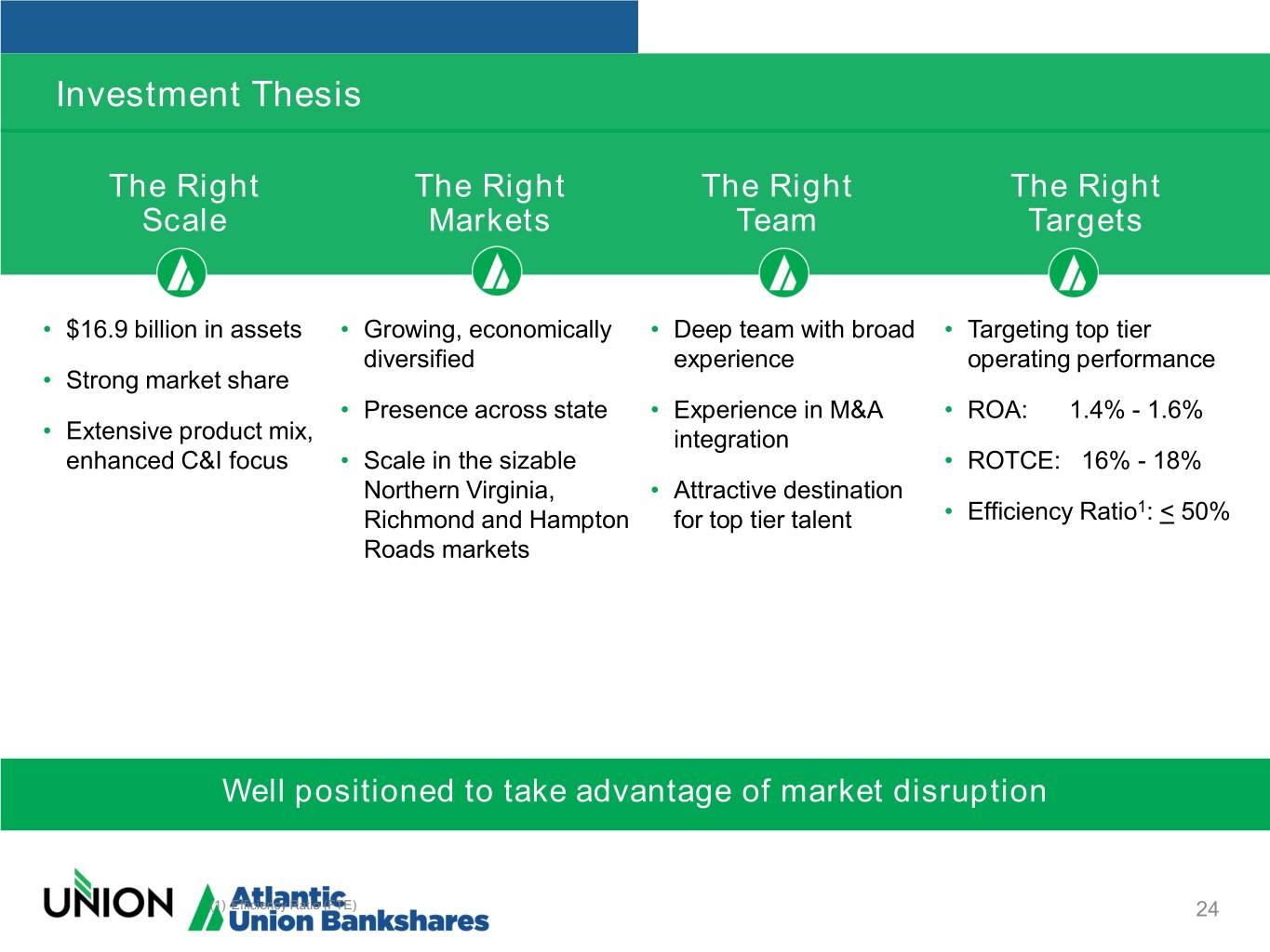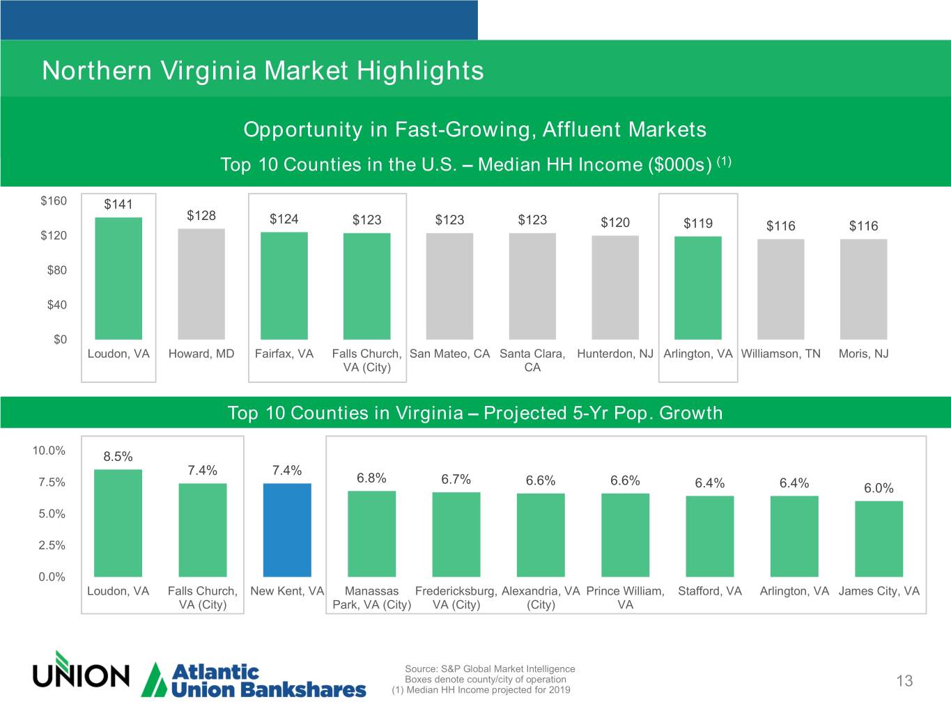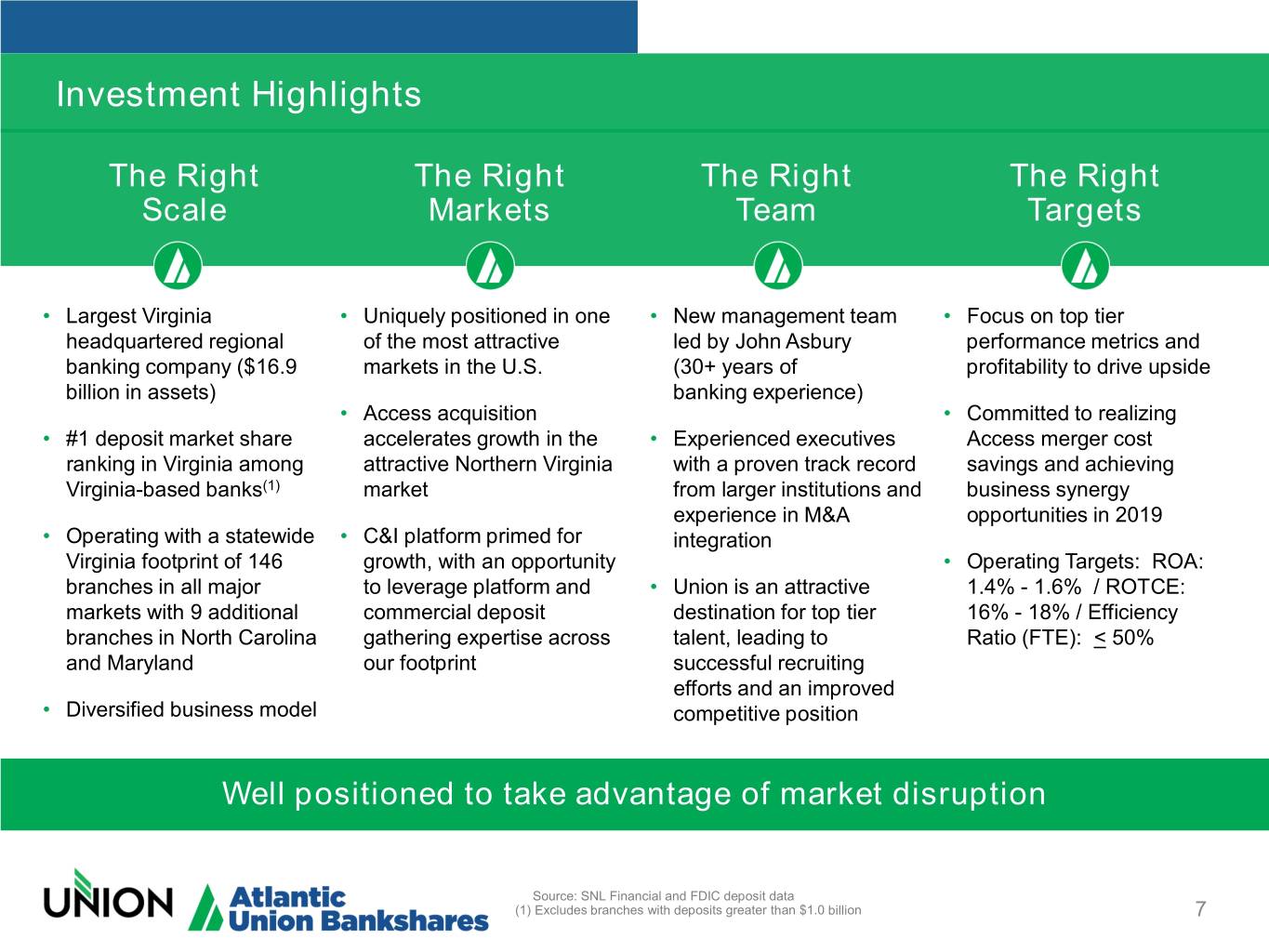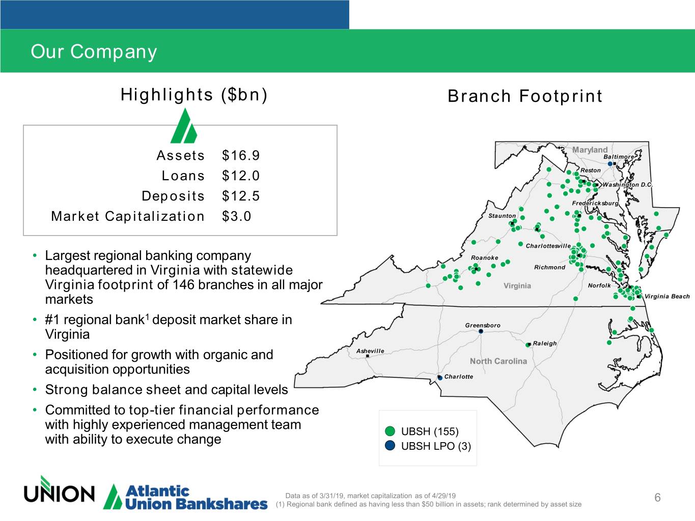 Forward Looking Statements Certain statements in this presentation may constitute “forward-looking statements” an insufficient allowance for loan losses; within the meaning of the Private Securities Litigation Reform Act of 1995. Forward- the quality or composition of the loan or investment portfolios; looking statements include, without limitation, projections, predictions, expectations or concentrations of loans secured by real estate, particularly commercial real estate; beliefs about future events or results that are not statements of historical fact. Such the effectiveness of the Company’s credit processes and management of the forward-looking statements are based on various assumptions as of the time they are Company’s credit risk; made, and are inherently subject to known and unknown risks, uncertainties, and other demand for loan products and financial services in the Company’s market area; factors that may cause actual results, performance or achievements to be materially the Company’s ability to compete in the market for financial services; different from those expressed or implied by such forward-looking statements. Forward- technological risks and developments, and cyber threats, attacks, or events; looking statements are often accompanied by words that convey projected future performance by the Company’s counterparties or vendors; events or outcomes such as “expect,” “believe,” “estimate,” “plan,” “project,” “anticipate,” deposit flows; “intend,” “will,” “may,” “view,” “opportunity,” “potential,” or words of similar meaning or the availability of financing and the terms thereof; other statements concerning opinions or judgment of Union Bankshares Corporation the level of prepayments on loans and mortgage-backed securities; (“Union” or the “Company”) and its management about future events. legislative or regulatory changes and requirements; the impact of the Tax Cuts and Jobs Act of 2017 (the “Tax Act”), including, but not Although Union believes that its expectations with respect to forward-looking limited to, the effect of the lower corporate tax rate, including on the valuation of the statements are based upon reasonable assumptions within the bounds of its existing Company’s tax assets and liabilities; knowledge of its business and operations, there can be no assurance that actual changes in the effect of the Tax Act due to issuance of interpretive regulatory results, performance, or achievements of, or trends affecting, the Company will not guidance or enactment of corrective or supplement legislation; differ materially from any projected future results, performance, or achievements or monetary and fiscal policies of the U.S. government including policies of the U.S. trends expressed or implied by such forward-looking statements. Actual future results, Department of the Treasury and the Board of Governors of the Federal Reserve performance, achievements or trends may differ materially from historical results or System; those anticipated depending on a variety of factors, including, but not limited to: changes to applicable accounting principles and guidelines; and other factors, many of which are beyond the control of the Company. changes in interest rates; general economic and financial market conditions in the United States generally and Please refer to the “Risk Factors” and “Management’s Discussion and Analysis of particularly in the markets in which the Company operates and which its loans are Financial Condition and Results of Operation” sections of the Company’s Annual concentrated, including the effects of declines in real estate values, an increase in Report on Form 10-K for the year ended December 31, 2018, comparable “Risk Factor” unemployment levels and slowdowns in economic growth; sections of the Company’s Quarterly Reports on Form 10-Q, and related disclosures in the Company’s ability to manage its growth or implement its growth strategy; other filings, which have been filed with the Securities and Exchange Commission (the the possibility that any of the anticipated benefits of the acquisition of Access “SEC”), and are available on the SEC’s website at www.sec.gov. All of the forward- National Corporation (together with subsidiaries, “Access”) will not be realized or will looking statements made in this presentation are expressly qualified by the cautionary not be realized within the expected time period, the expected revenue synergies and statements contained or referred to herein. The actual results or developments cost savings from the acquisition may not be fully realized or realized within the anticipated may not be realized or, even if substantially realized, they may not have the expected time frame, revenues following the acquisition may be lower than expected, expected consequences to or effects on the Company or its businesses or operations. or customer and employee relationships and business operations may be disrupted You are cautioned not to rely too heavily on the forward-looking statements contained in by the acquisition; this presentation. Forward-looking statements speak only as of the date they are made the Company’s ability to recruit and retain key employees; and the Company does not undertake any obligation to update, revise or clarify these the incremental cost and/or decreased revenues associated with exceeding $10 forward-looking statements, whether as a result of new information, future events or billion in assets; otherwise. real estate values in the Company’s lending area; 2
