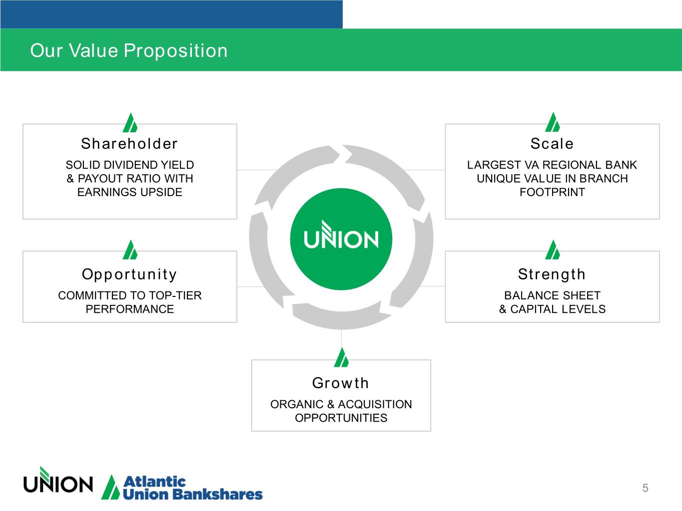 The “New Union” Story: FROM VIRGINIA COMMUNITY BANK TO VIRGINIA’S BANK Virginia’s Bank The Union “Moat” • Franchise cannot be replicated • Virginia’s first statewide, independent bank in 20 years • “Crown jewel” deposit base - 44% transaction accounts • The alternative to large competitors • Dense, compact and contiguous $16B+ bank • Organic growth model + effective consolidator Larger Bank Executive Leadership Talent Magnet • Knows the “seams” of the large institutions & how to • Extensive hiring from larger institutions at all levels compete against them • 25 C&I bankers in 2018, we know the people we hire • Makes tough decisions – think differently, challenge, and rarely use recruiters escape the past • All market leaders and bankers hired from the markets • Accustomed to more complex environment than Union they serve “Soundness, profitability & growth in that order of priority” Underpinning for how we run our company 4