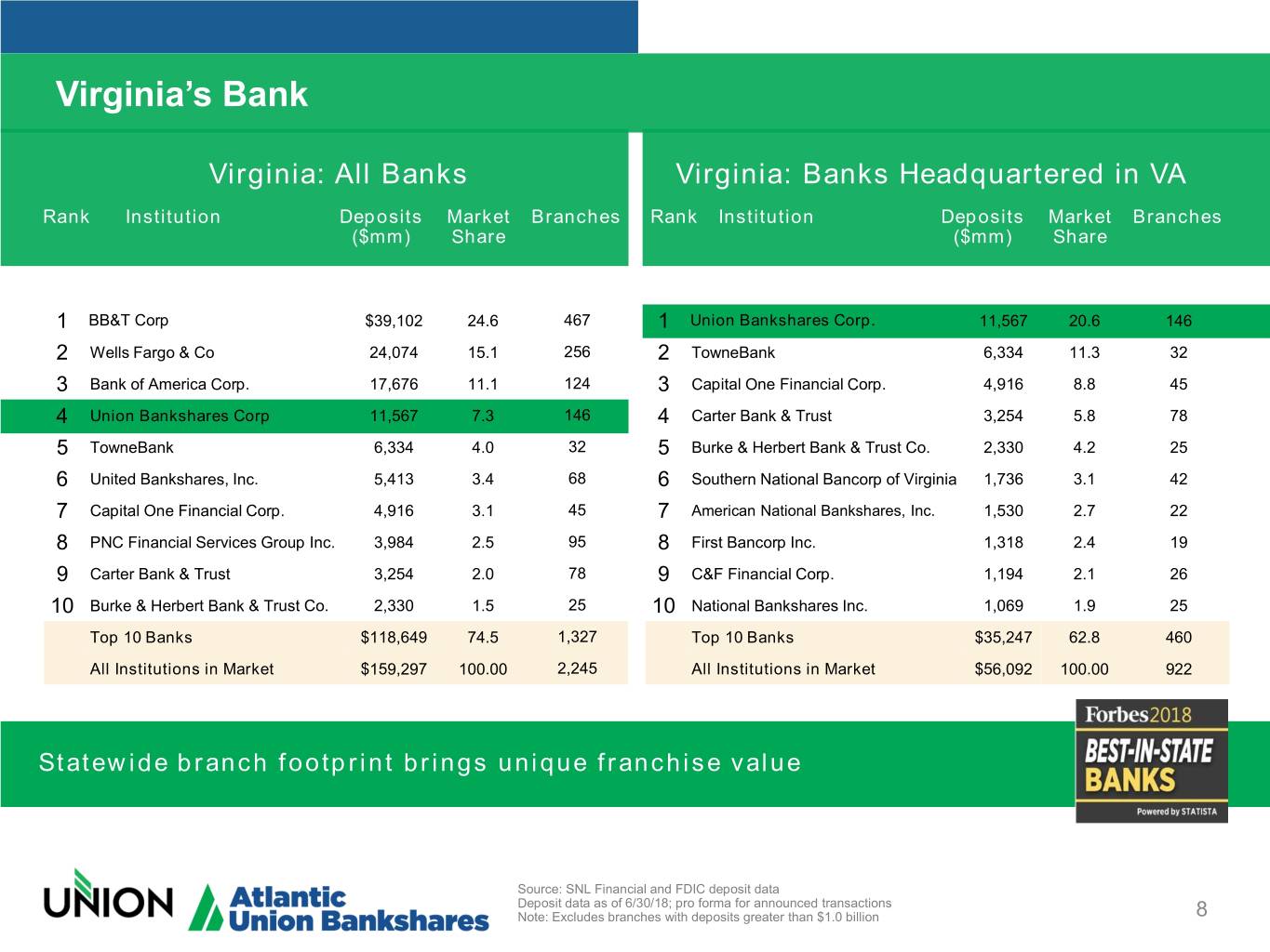 Investment Highlights The Right The Right The Right The Right Scale Markets Team Targets • Largest Virginia • Uniquely positioned in one • New management team • Focus on top tier headquartered regional of the most attractive led by John Asbury performance metrics and banking company ($16.9 markets in the U.S. (30+ years of profitability to drive upside billion in assets) banking experience) • Access acquisition • Committed to realizing • #1 deposit market share accelerates growth in the • Experienced executives Access merger cost ranking in Virginia among attractive Northern Virginia with a proven track record savings and achieving Virginia-based banks(1) market from larger institutions and business synergy experience in M&A opportunities in 2019 • Operating with a statewide • C&I platform primed for integration Virginia footprint of 146 growth, with an opportunity • Operating Targets: ROA: branches in all major to leverage platform and • Union is an attractive 1.4% - 1.6% / ROTCE: markets with 9 additional commercial deposit destination for top tier 16% - 18% / Efficiency branches in North Carolina gathering expertise across talent, leading to Ratio (FTE): < 50% and Maryland our footprint successful recruiting efforts and an improved • Diversified business model competitive position Well positioned to take advantage of market disruption Source: SNL Financial and FDIC deposit data (1) Excludes branches with deposits greater than $1.0 billion 7