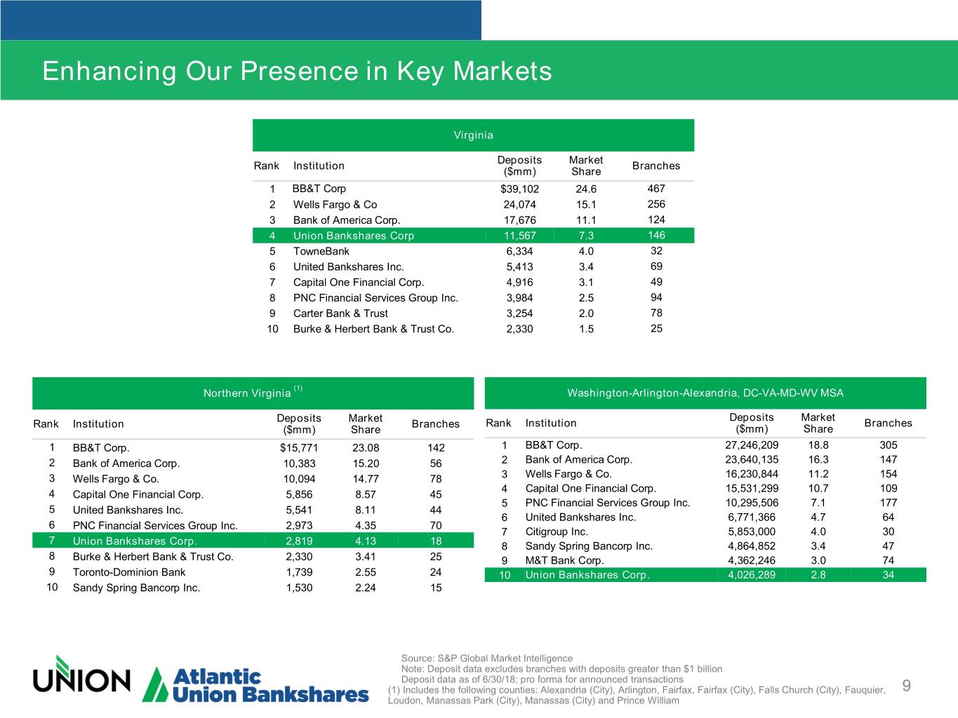 Virginia’s Bank Virginia: All Banks Virginia: Banks Headquartered in VA Rank Institution Deposits Market Branches Rank Institution Deposits Market Branches ($mm) Share ($mm) Share 1 BB&T Corp $39,102 24.6 467 1 Union Bankshares Corp. 11,567 20.6 146 2 Wells Fargo & Co 24,074 15.1 256 2 TowneBank 6,334 11.3 32 3 Bank of America Corp. 17,676 11.1 124 3 Capital One Financial Corp. 4,916 8.8 45 4 Union Bankshares Corp 11,567 7.3 146 4 Carter Bank & Trust 3,254 5.8 78 5 TowneBank 6,334 4.0 32 5 Burke & Herbert Bank & Trust Co. 2,330 4.2 25 6 United Bankshares, Inc. 5,413 3.4 68 6 Southern National Bancorp of Virginia 1,736 3.1 42 7 Capital One Financial Corp. 4,916 3.1 45 7 American National Bankshares, Inc. 1,530 2.7 22 8 PNC Financial Services Group Inc. 3,984 2.5 95 8 First Bancorp Inc. 1,318 2.4 19 9 Carter Bank & Trust 3,254 2.0 78 9 C&F Financial Corp. 1,194 2.1 26 10 Burke & Herbert Bank & Trust Co. 2,330 1.5 25 10 National Bankshares Inc. 1,069 1.9 25 Top 10 Banks $118,649 74.5 1,327 Top 10 Banks $35,247 62.8 460 All Institutions in Market $159,297 100.00 2,245 All Institutions in Market $56,092 100.00 922 Statewide branch footprint brings unique franchise value Source: SNL Financial and FDIC deposit data Deposit data as of 6/30/18; pro forma for announced transactions Note: Excludes branches with deposits greater than $1.0 billion 8