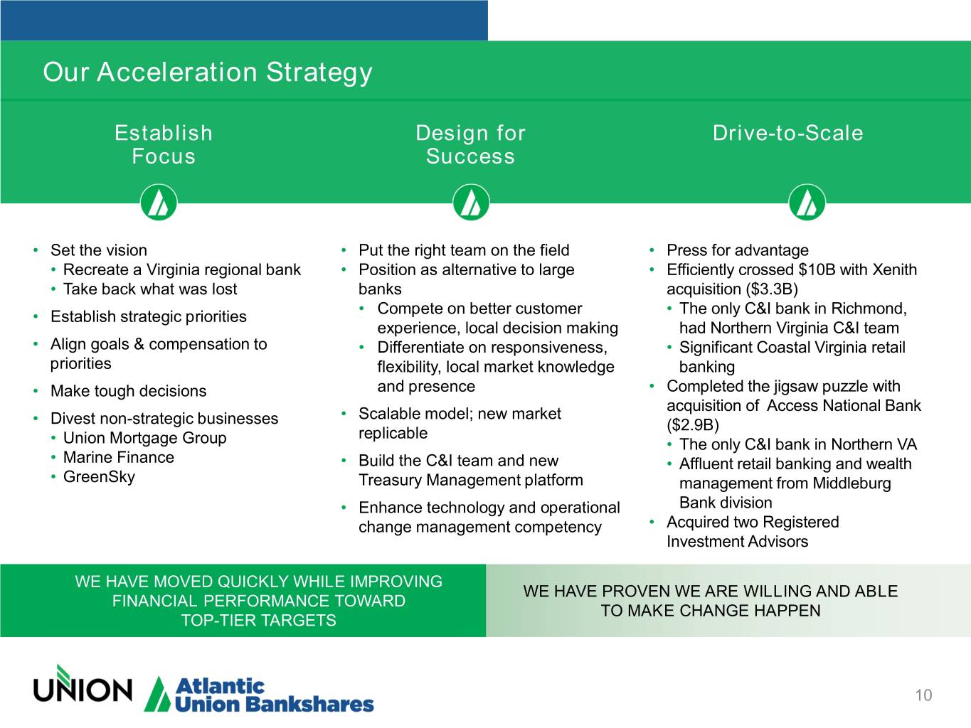 Our Acceleration Strategy Establish Design for Drive-to-Scale Focus Success • Set the vision • Put the right team on the field • Press for advantage • Recreate a Virginia regional bank • Position as alternative to large • Efficiently crossed $10B with Xenith • Take back what was lost banks acquisition ($3.3B) • Establish strategic priorities • Compete on better customer • The only C&I bank in Richmond, experience, local decision making had Northern Virginia C&I team • Align goals & compensation to • Differentiate on responsiveness, • Significant Coastal Virginia retail priorities flexibility, local market knowledge banking • Make tough decisions and presence • Completed the jigsaw puzzle with acquisition of Access National Bank • Divest non-strategic businesses • Scalable model; new market replicable ($2.9B) • Union Mortgage Group • The only C&I bank in Northern VA • Marine Finance • Build the C&I team and new • Affluent retail banking and wealth • GreenSky Treasury Management platform management from Middleburg • Enhance technology and operational Bank division change management competency • Acquired two Registered Investment Advisors WE HAVE MOVED QUICKLY WHILE IMPROVING WE HAVE PROVEN WE ARE WILLING AND ABLE FINANCIAL PERFORMANCE TOWARD TO MAKE CHANGE HAPPEN TOP-TIER TARGETS 10
