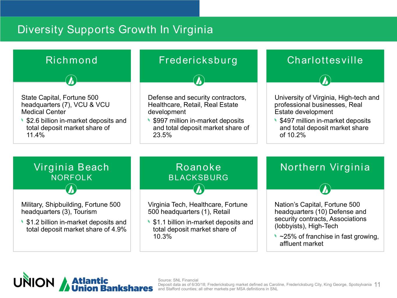 Enhancing Our Presence in Key Markets Virginia Deposits Market Rank Institution Branches ($mm) Share 1 BB&T Corp $39,102 24.6 467 2 Wells Fargo & Co 24,074 15.1 256 3 Bank of America Corp. 17,676 11.1 124 4 Union Bankshares Corp 11,567 7.3 146 5 TowneBank 6,334 4.0 32 6 United Bankshares Inc. 5,413 3.4 69 7 Capital One Financial Corp. 4,916 3.1 49 8 PNC Financial Services Group Inc. 3,984 2.5 94 9 Carter Bank & Trust 3,254 2.0 78 10 Burke & Herbert Bank & Trust Co. 2,330 1.5 25 (1) Northern Virginia Washington-Arlington-Alexandria, DC-VA-MD-WV MSA Deposits Market Deposits Market Rank Institution Branches Rank Institution Branches ($mm) Share ($mm) Share 1 BB&T Corp. $15,771 23.08 142 1 BB&T Corp. 27,246,209 18.8 305 2 Bank of America Corp. 10,383 15.20 56 2 Bank of America Corp. 23,640,135 16.3 147 3 Wells Fargo & Co. 10,094 14.77 78 3 Wells Fargo & Co. 16,230,844 11.2 154 4 Capital One Financial Corp. 15,531,299 10.7 109 4 Capital One Financial Corp. 5,856 8.57 45 5 PNC Financial Services Group Inc. 10,295,506 7.1 177 5 United Bankshares Inc. 5,541 8.11 44 6 United Bankshares Inc. 6,771,366 4.7 64 6 PNC Financial Services Group Inc. 2,973 4.35 70 7 Citigroup Inc. 5,853,000 4.0 30 7 Union Bankshares Corp. 2,819 4.13 18 8 Sandy Spring Bancorp Inc. 4,864,852 3.4 47 8 Burke & Herbert Bank & Trust Co. 2,330 3.41 25 9 M&T Bank Corp. 4,362,246 3.0 74 9 Toronto-Dominion Bank 1,739 2.55 24 10 Union Bankshares Corp. 4,026,289 2.8 34 10 Sandy Spring Bancorp Inc. 1,530 2.24 15 Source: S&P Global Market Intelligence Note: Deposit data excludes branches with deposits greater than $1 billion Deposit data as of 6/30/18; pro forma for announced transactions (1) Includes the following counties: Alexandria (City), Arlington, Fairfax, Fairfax (City), Falls Church (City), Fauquier, 9 Loudon, Manassas Park (City), Manassas (City) and Prince William