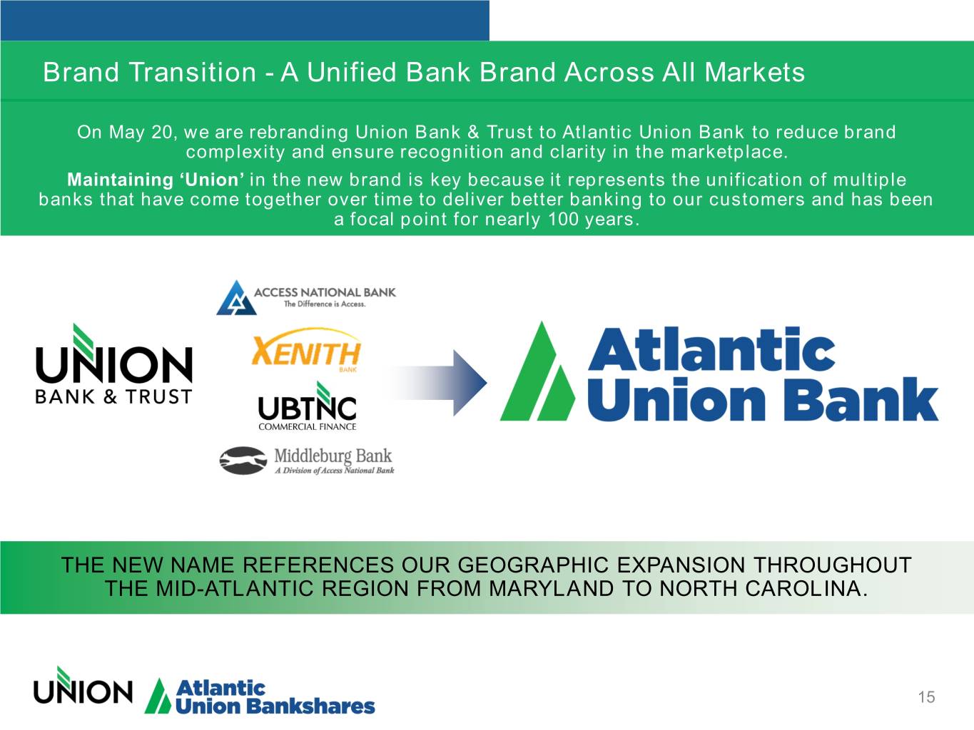 Brand Transition - A Unified Bank Brand Across All Markets On May 20, we are rebranding Union Bank & Trust to Atlantic Union Bank to reduce brand complexity and ensure recognition and clarity in the marketplace. Maintaining ‘Union’ in the new brand is key because it represents the unification of multiple banks that have come together over time to deliver better banking to our customers and has been a focal point for nearly 100 years. THE NEW NAME REFERENCES OUR GEOGRAPHIC EXPANSION THROUGHOUT THE MID-ATLANTIC REGION FROM MARYLAND TO NORTH CAROLINA. 15