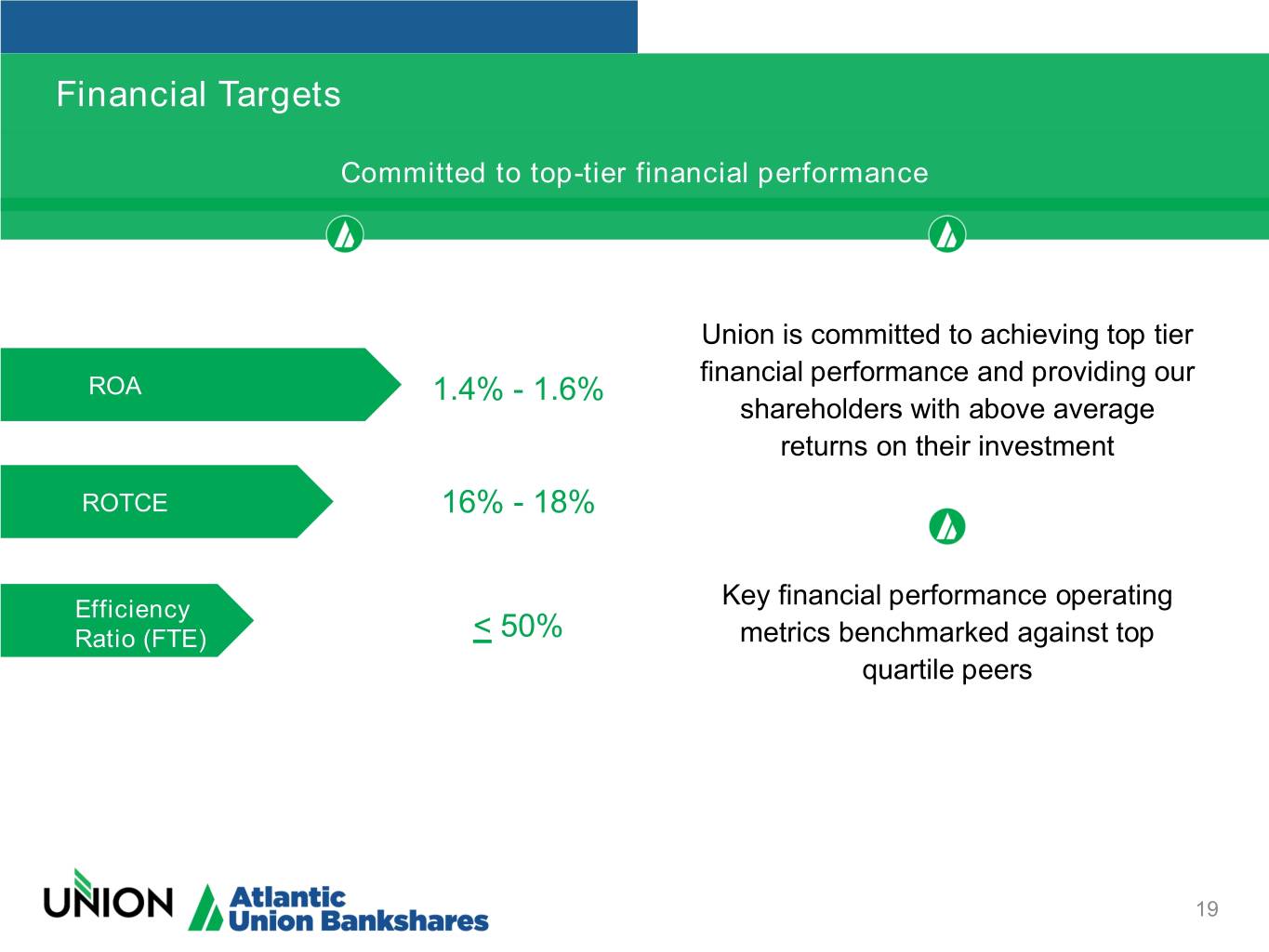 Financial Targets Committed to top-tier financial performance Union is committed to achieving top tier financial performance and providing our ROA 1.4% - 1.6% shareholders with above average returns on their investment ROTCE 16% - 18% Efficiency Key financial performance operating Ratio (FTE) < 50% metrics benchmarked against top quartile peers 19