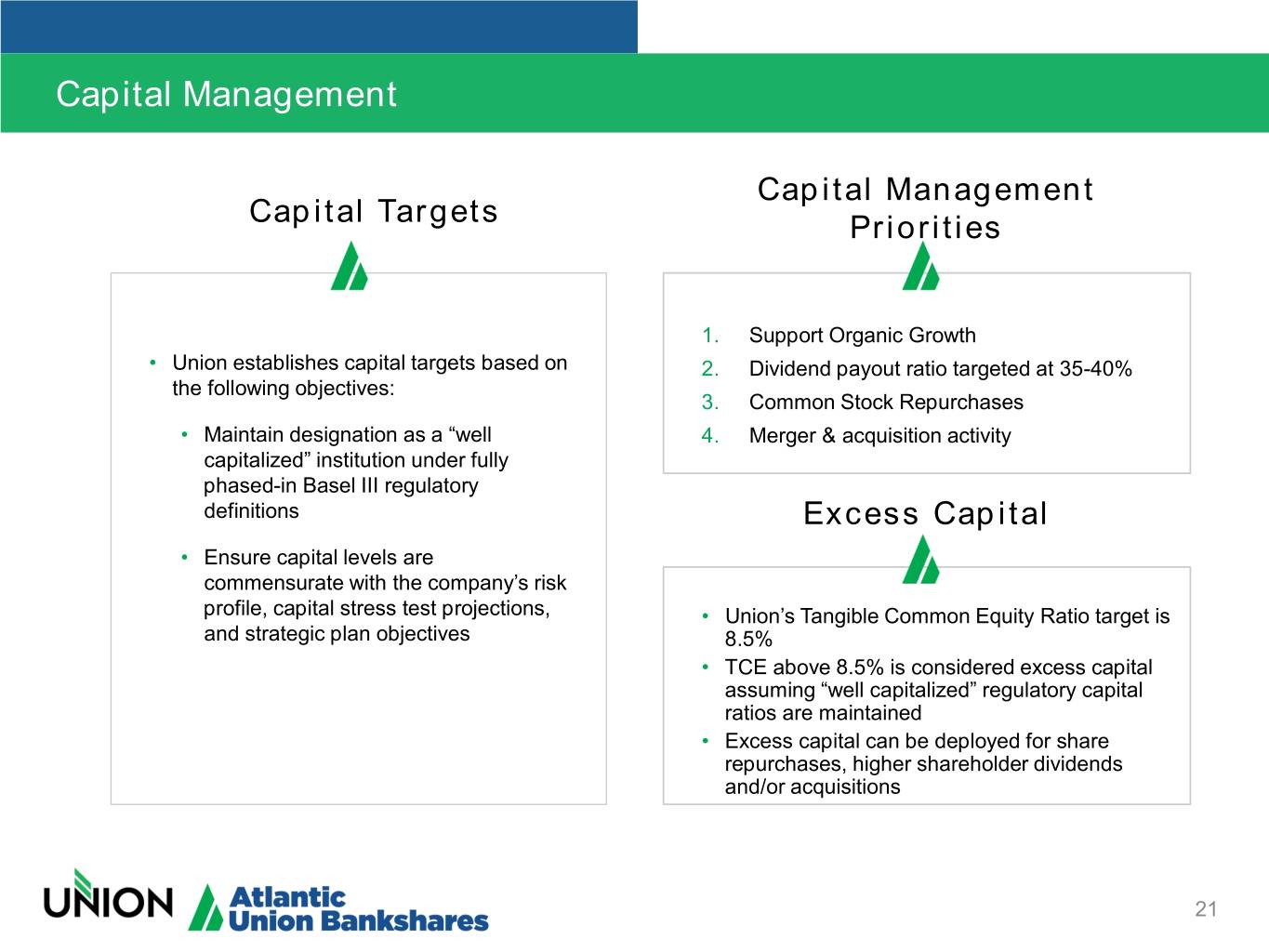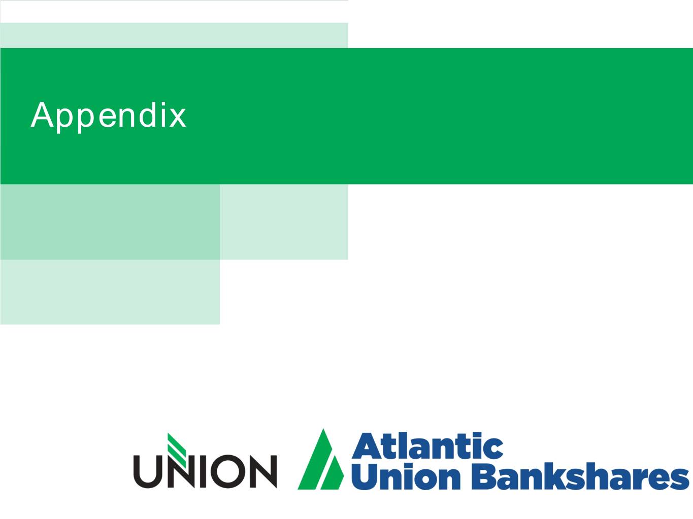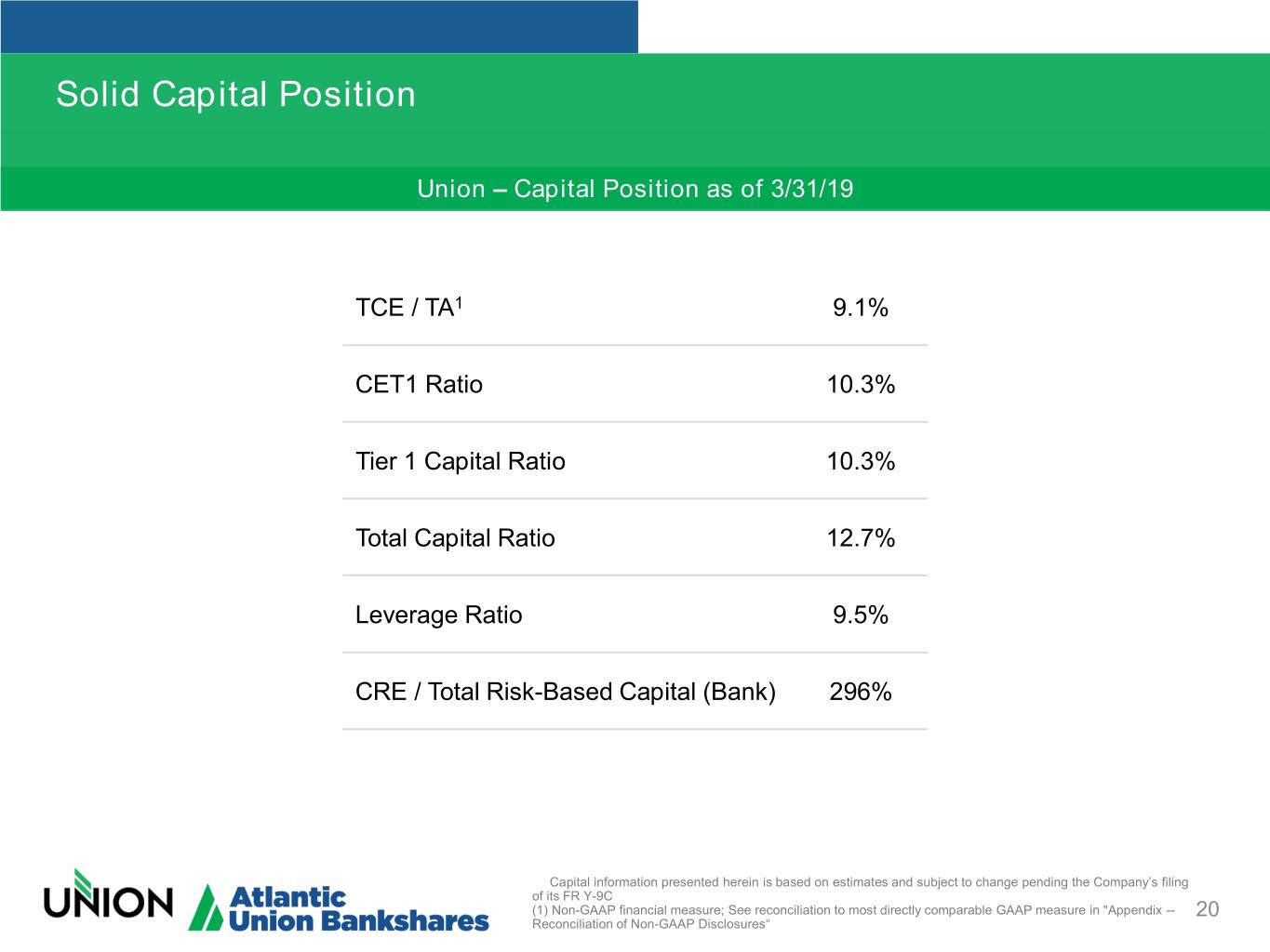 Solid Capital Position Union – Capital Position as of 3/31/19 TCE / TA1 9.1% CET1 Ratio 10.3% Tier 1 Capital Ratio 10.3% Total Capital Ratio 12.7% Leverage Ratio 9.5% CRE / Total Risk-Based Capital (Bank) 296% Capital information presented herein is based on estimates and subject to change pending the Company’s filing of its FR Y-9C (1) Non-GAAP financial measure; See reconciliation to most directly comparable GAAP measure in "Appendix -- 20 Reconciliation of Non-GAAP Disclosures“