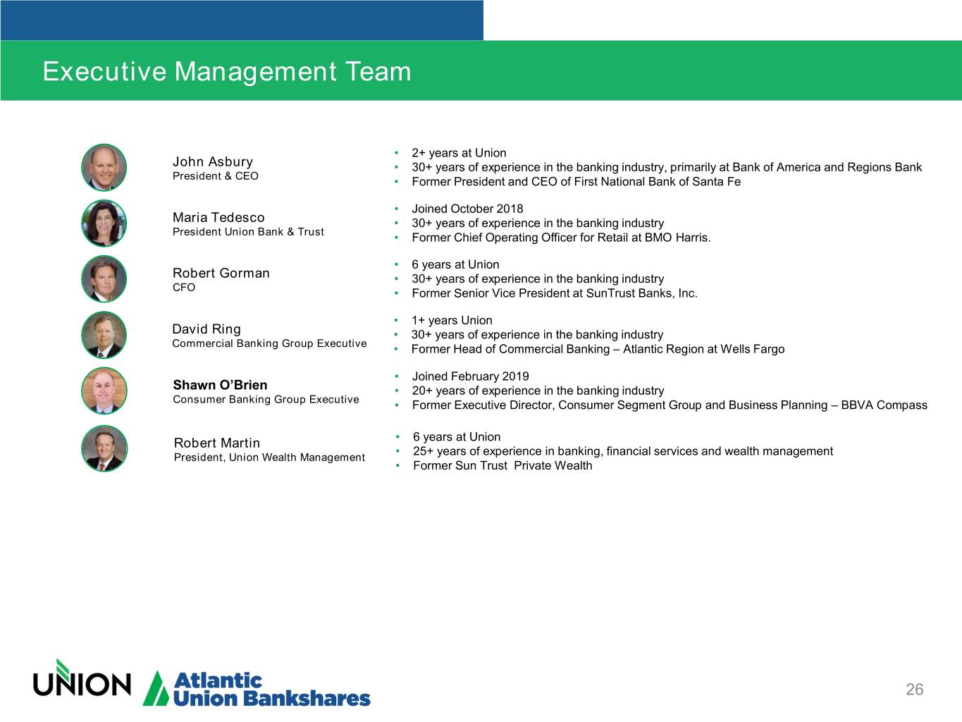 Executive Management Team • 2+ years at Union John Asbury • 30+ years of experience in the banking industry, primarily at Bank of America and Regions Bank President & CEO • Former President and CEO of First National Bank of Santa Fe • Joined October 2018 Maria Tedesco • 30+ years of experience in the banking industry President Union Bank & Trust • Former Chief Operating Officer for Retail at BMO Harris. • 6 years at Union Robert Gorman • 30+ years of experience in the banking industry CFO • Former Senior Vice President at SunTrust Banks, Inc. • 1+ years Union David Ring • 30+ years of experience in the banking industry Commercial Banking Group Executive • Former Head of Commercial Banking – Atlantic Region at Wells Fargo • Joined February 2019 Shawn O’Brien • 20+ years of experience in the banking industry Consumer Banking Group Executive • Former Executive Director, Consumer Segment Group and Business Planning – BBVA Compass Robert Martin • 6 years at Union • 25+ years of experience in banking, financial services and wealth management President, Union Wealth Management • Former Sun Trust Private Wealth 26