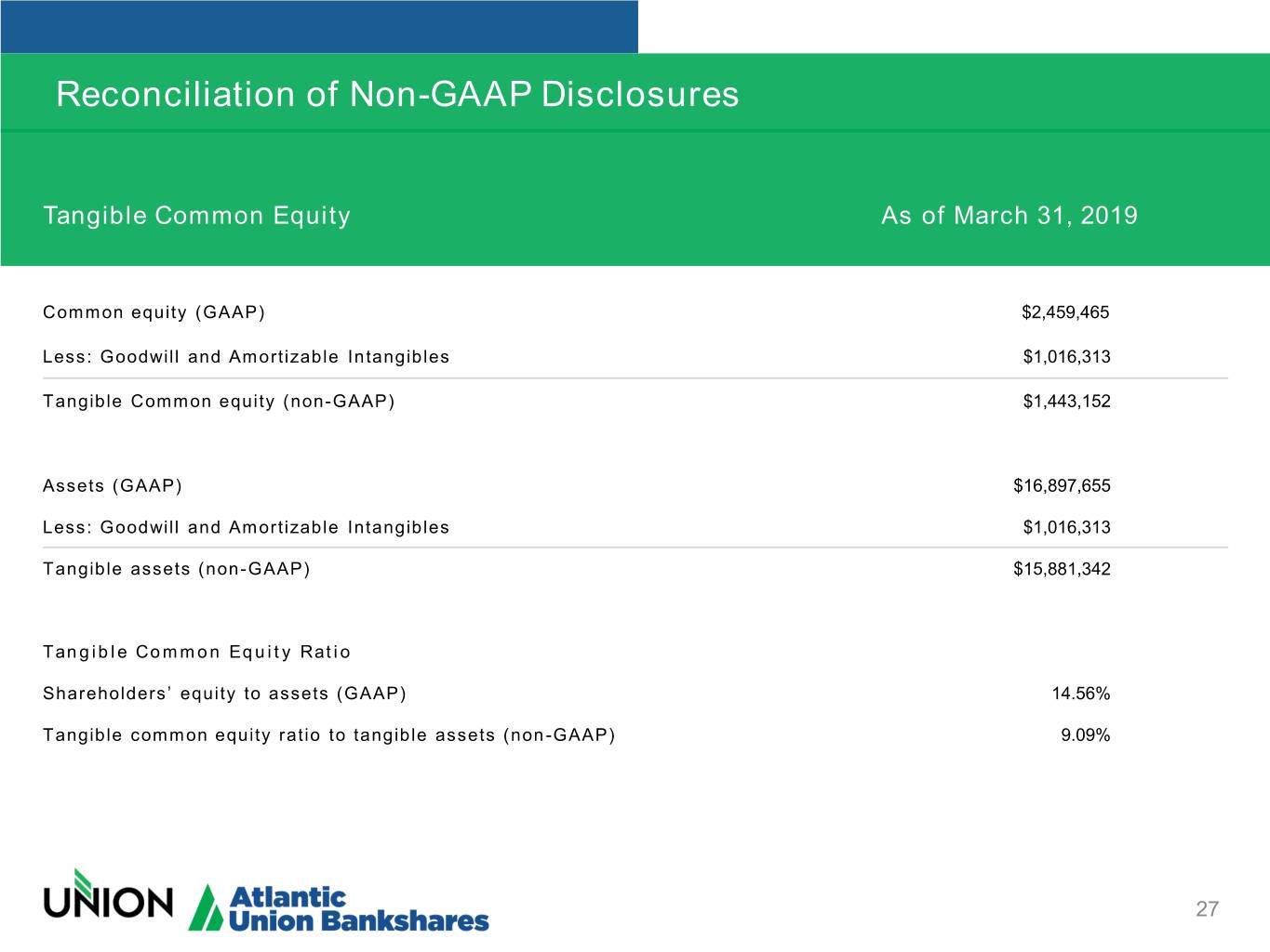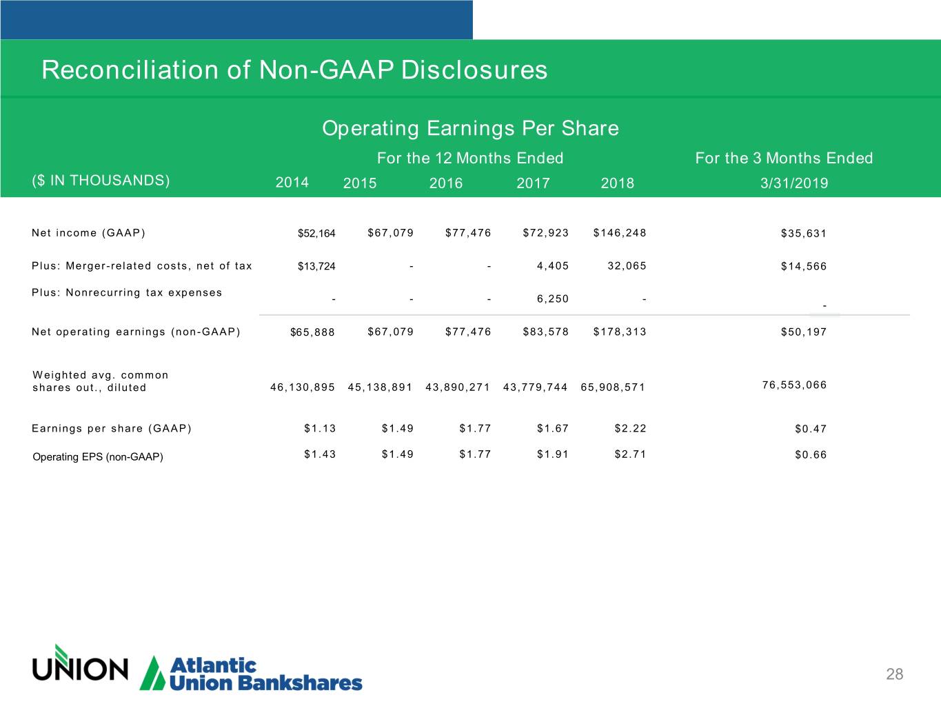 Reconciliation of Non-GAAP Disclosures Tangible Common Equity As of March 31, 2019 Common equity (GAAP) $2,459,465 Less: Goodwill and Amortizable Intangibles $1,016,313 Tangible Common equity (non-GAAP) $1,443,152 Assets (GAAP) $16,897,655 Less: Goodwill and Amortizable Intangibles $1,016,313 Tangible assets (non-GAAP) $15,881,342 Tangible Common Equity Ratio Shareholders’ equity to assets (GAAP) 14.56% Tangible common equity ratio to tangible assets (non-GAAP) 9.09% 27
