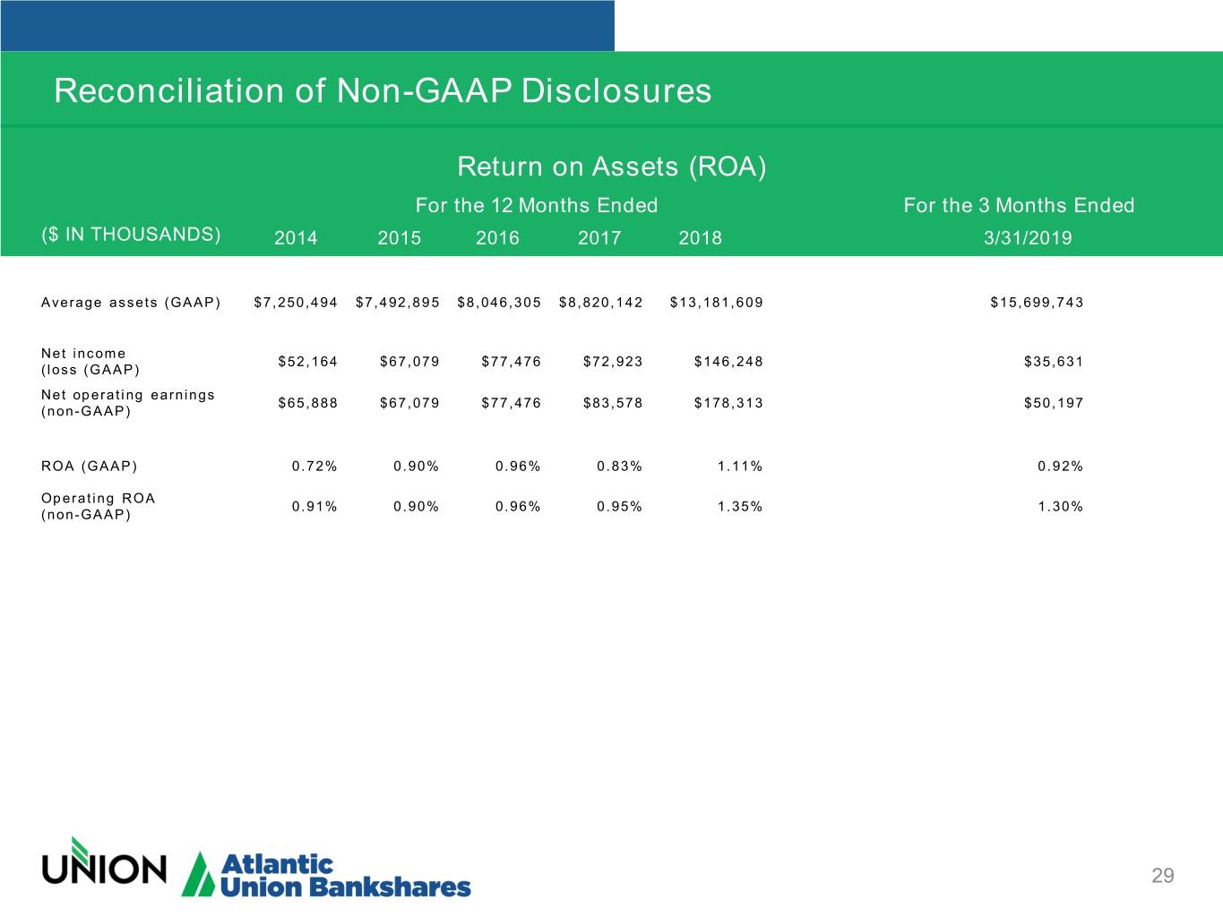 Reconciliation of Non-GAAP Disclosures Return on Assets (ROA) For the 12 Months Ended For the 3 Months Ended ($ IN THOUSANDS) 2014 2015 2016 2017 2018 3/31/2019 Average assets (GAAP) $7,250,4 9 4 $7,492,8 9 5 $8,046,3 0 5 $8,820,1 4 2 $13,181, 6 0 9 $15,699, 7 4 3 Net incom e $52,164 $67,079 $77,476 $72,923 $146,24 8 $35,631 (loss (GAAP) Net operating earnings $65,888 $67,079 $77,476 $83,578 $178,31 3 $50,197 (non-GAAP) ROA (GAAP) 0.72% 0.90% 0.96% 0.83% 1.11% 0.92% Operating ROA 0.91% 0.90% 0.96% 0.95% 1.35% 1.30% (non-GAAP) 29