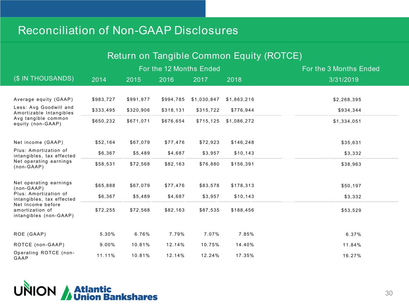 Reconciliation of Non-GAAP Disclosures Return on Tangible Common Equity (ROTCE) For the 12 Months Ended For the 3 Months Ended ($ IN THOUSANDS) 2014 2015 2016 2017 2018 3/31/2019 Average equity (GAAP) $983,72 7 $991,97 7 $994,78 5 $1,030,8 4 7 $1,863,2 1 6 $2,268,3 9 5 Less: Avg Goodwill and $333,49 5 $320,90 6 $318,13 1 $315,72 2 $776,94 4 $934,3 44 Am ortizable Intangibles Avg tangible com m on $650,23 2 $671,07 1 $676,65 4 $715,12 5 $1,086,2 7 2 $1,334,0 5 1 equity (non-GAAP) Net incom e (GAAP) $52,164 $67,079 $77,476 $72,923 $146,24 8 $35,631 Plus: Am ortization of $6,367 $5,489 $4,687 $3,957 $10,143 $3,332 intangibles, tax effected Net operating earnings $58,531 $72,568 $82,163 $76,880 $156,39 1 $38,963 (non-GAAP) Net operating earnings $65,888 $67,079 $77,476 $83,578 $178,31 3 $50,197 (non-GAAP) Plus: Am ortization of $6,367 $5,489 $4,687 $3,957 $10,143 $3,332 intangibles, tax effected Net Incom e before am ortization of $72,255 $72,568 $82,163 $87,535 $188,456 $53,529 intangibles (non -GAAP) ROE (GAAP) 5.30% 6.76% 7.79% 7.07% 7.85% 6.37% ROTCE (non-GAAP) 9.00% 10.81% 12.14% 10.75% 14.40% 11.84% Operating ROTCE (non - 11.11% 10.81% 12.14% 12.24% 17.35% 16.27% GAAP 30
