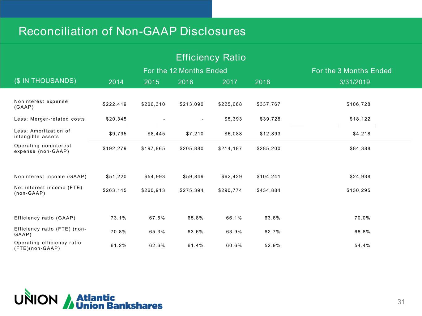 Reconciliation of Non-GAAP Disclosures Efficiency Ratio For the 12 Months Ended For the 3 Months Ended ($ IN THOUSANDS) 2014 2015 2016 2017 2018 3/31/2019 Noninterest expens e $222,41 9 $206,31 0 $213,09 0 $225,66 8 $337,76 7 $106,72 8 (GAAP) Less: Merger-rel at ed costs $20,345 - - $5,393 $39,728 $18,122 Less: Am ortization of $9,795 $8,445 $7,210 $6,088 $12,893 $4,218 intangible assets Operating noninterest $192,27 9 $197,86 5 $205,88 0 $214,18 7 $285,20 0 $84,388 expense (non-GAAP) Noninterest incom e (GAAP) $51,220 $54,993 $59,849 $62,429 $104,24 1 $24,938 Net interest incom e (FTE) $263,14 5 $260,91 3 $275,39 4 $290,77 4 $434,88 4 $130,29 5 (non-GAAP) Efficiency ratio (GAAP) 73.1% 67.5% 65.8% 66.1% 63.6% 70.0% Efficiency ratio (FTE) (non - 70.8% 65.3% 63.6% 63.9% 62.7% 68.8% GAAP) Operating efficiency ratio 61.2% 62.6% 61.4% 60.6% 52.9% 54.4% (FTE)(non-GAAP) 31