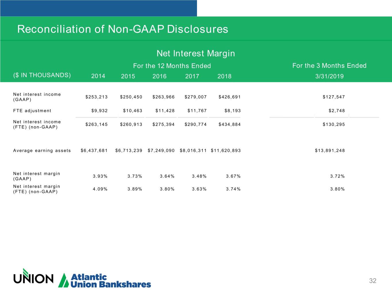 Reconciliation of Non-GAAP Disclosures Net Interest Margin For the 12 Months Ended For the 3 Months Ended ($ IN THOUSANDS) 2014 2015 2016 2017 2018 3/31/2019 Net interest incom e $253,21 3 $250,45 0 $263,96 6 $279,00 7 $426,69 1 $127,54 7 (GAAP) FTE adjustm ent $9,932 $10,463 $11,428 $11,767 $8,193 $2,748 Net interest incom e $263,14 5 $260,91 3 $275,39 4 $290,77 4 $434,88 4 $130,29 5 (FTE) (non-GAAP) Average earning assets $6,437,6 8 1 $6,713,2 3 9 $7,249,0 9 0 $8,016,3 1 1 $11,620, 8 9 3 $13,891, 2 4 8 Net interest m argin 3.93% 3.73% 3.64% 3.48% 3.67% 3.72% (GAAP) Net interest m argin 4.09% 3.89% 3.80% 3.63% 3.74% 3.80% (FTE) (non-GAAP) 32