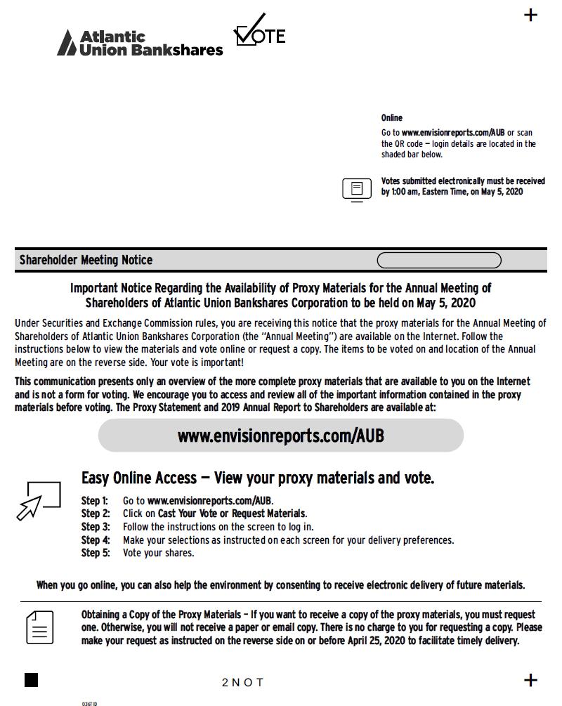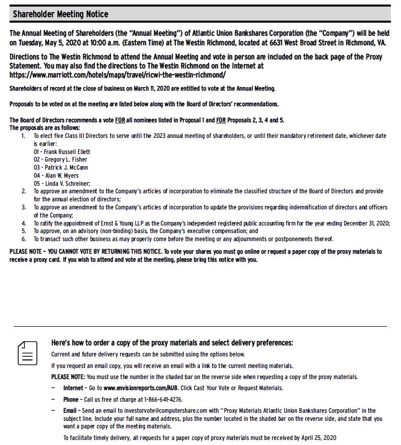 Shareholder Meeting Notice The Annual Meeting of Shareholders (the “Annual Meeting”) of Atlantic Union Bankshares Corporation (the “Company”) will be held on Tuesday, May 5, 2020 at 10:00 a.m. (Eastern Time) at The Westin Richmond, located at 6631 West Broad Street in Richmond, VA. Directions to The Westin Richmond to attend the Annual Meeting and vote in person are included on the back page of the Proxy Statement. You may also find the directions to The Westin Richmond on the Internet at https://www.marriott.com/hotels/maps/travel/ricwi-the-westin-richmond/Shareholders of record at the close of business on March 11, 2020 are entitled to vote at the Annual Meeting. Proposals to be voted on at the meeting are listed below along with the Board of Directors’ recommendations. The Board of Directors recommends a vote FOR all nominees listed in Proposal 1 and FOR Proposals 2, 3, 4 and 5. The proposals are as follows: 1. To elect five Class III Directors to serve until the 2023 annual meeting of shareholders, or until their mandatory retirement date, whichever date is earlier: 01 - Frank Russell Ellett 02 - Gregory L. Fisher 03 - Patrick J. McCann 04 - Alan W. Myers 05 - Linda V. Schreiner; 2. To approve an amendment to the Company’s articles of incorporation to eliminate the classified structure of the Board of Directors and provide for the annual election of directors; 3. To approve an amendment to the Company’s articles of incorporation to update the provisions regarding indemnification of directors and officers of the Company; 4. To ratify the appointment of Ernst & Young LLP as the Company’s independent registered public accounting firm for the year ending December 31, 2020; 5. To approve, on an advisory (non-binding) basis, the Company’s executive compensation; and 6. To transact such other business as may properly come before the meeting or any adjournments or postponements thereof. PLEASE NOTE – YOU CANNOT VOTE BY RETURNING THIS NOTICE. To vote your shares you must go online or request a paper copy of the proxy materials to receive a proxy card. If you wish to attend and vote at the meeting, please bring this notice with you.Here’s how to order a copy of the proxy materials and select delivery preferences: Current and future delivery requests can be submitted using the options below. If you request an email copy, you will receive an email with a link to the current meeting materials. PLEASE NOTE: You must use the number in the shaded bar on the reverse side when requesting a copy of the proxy materials. — Internet – Go to www.envisionreports.com/AUB. Click Cast Your Vote or Request Materials. — Phone – Call us free of charge at 1-866-641-4276. — Email – Send an email to investorvote@computershare.com with “Proxy Materials Atlantic Union Bankshares Corporation” in the subject line. Include your full name and address, plus the number located in the shaded bar on the reverse side, and state that you want a paper copy of the meeting materials. To facilitate timely delivery, all requests for a paper copy of proxy materials must be received by April 25, 2020