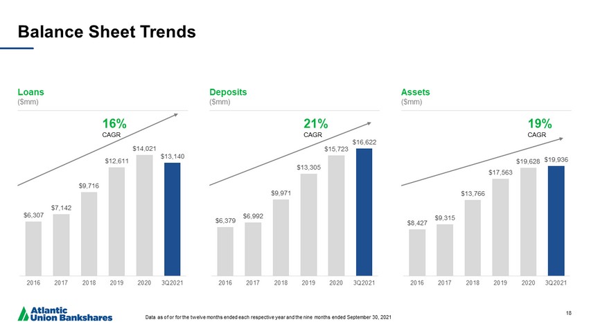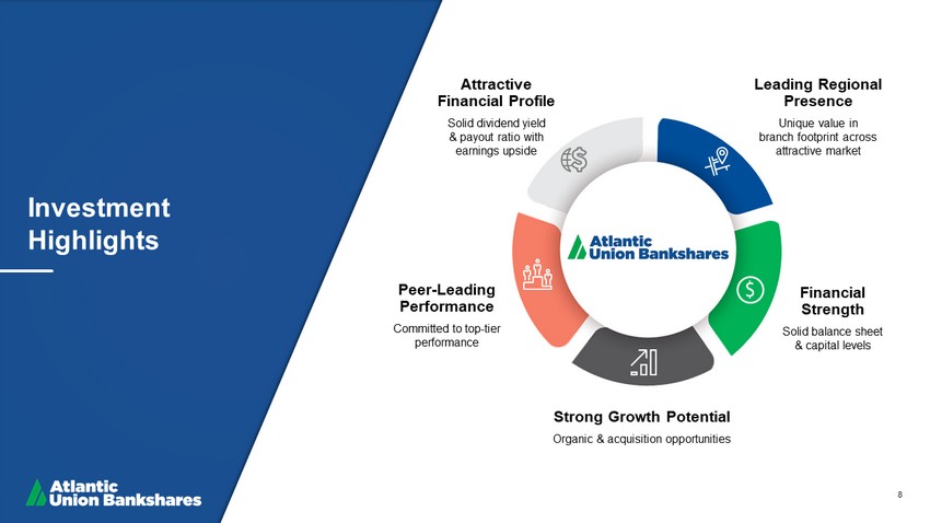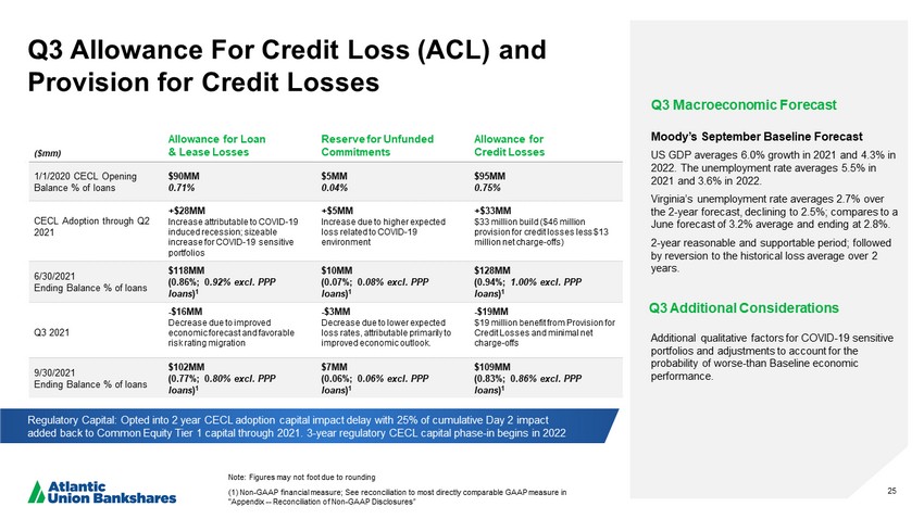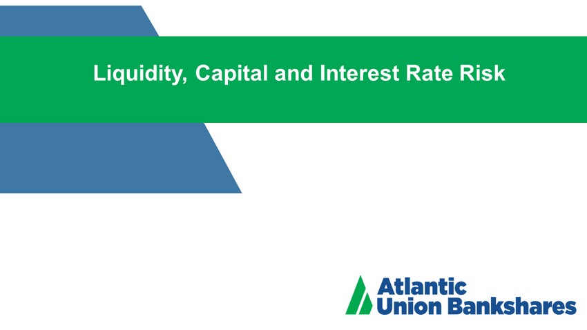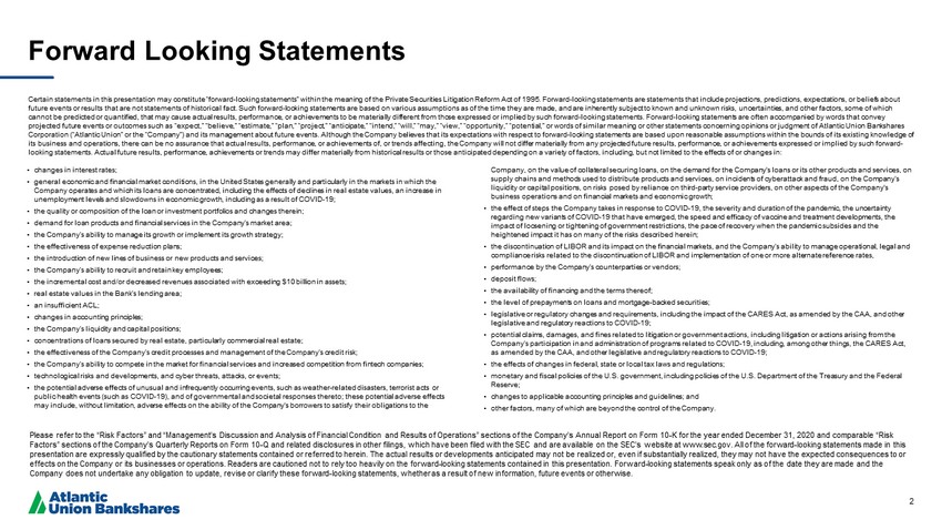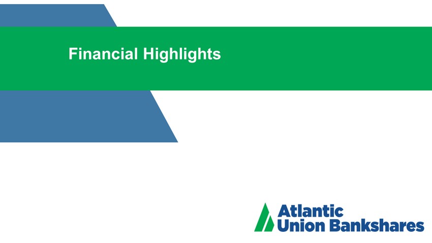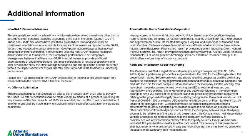 2 Forward Looking Statements Certain statements in this presentation may constitute “forward - looking statements” within the meaning of the Private Securities Litigation Reform Act of 1995. Forward - looking statements are statements that include projections, predictions, expectations, o r beliefs about future events or results that are not statements of historical fact. Such forward - looking statements are based on various assump tions as of the time they are made, and are inherently subject to known and unknown risks, uncertainties, and other factors, som e of which cannot be predicted or quantified, that may cause actual results, performance, or achievements to be materially different fro m t hose expressed or implied by such forward - looking statements. Forward - looking statements are often accompanied by words that con vey projected future events or outcomes such as “expect,” “believe,” “estimate,” “plan,” “project,” “anticipate,” “intend,” “will ,” “may,” “view,” “opportunity,” “potential,” or words of similar meaning or other statements concerning opinions or judgment of At lantic Union Bankshares Corporation (“Atlantic Union” or the “Company”) and its management about future events. Although the Company believes that its expectations with respect to fo rward - looking statements are based upon reasonable assumptions within the bounds of its existing knowledge of its business and operations, there can be no assurance that actual results, performance, or achievements of, or trends affect ing , the Company will not differ materially from any projected future results, performance, or achievements expressed or implied by such forward - looking statements. Actual future results, performance, achievements or trends may differ materially from historical results or those anticipated depending on a variety of factors, including, but not limited to the effects of or changes in: • changes in interest rates; • general economic and financial market conditions, in the United States generally and particularly in the markets in which the Company operates and which its loans are concentrated, including the effects of declines in real estate values, an increase i n unemployment levels and slowdowns in economic growth, including as a result of COVID - 19; • the quality or composition of the loan or investment portfolios and changes therein; • demand for loan products and financial services in the Company’s market area; • the Company’s ability to manage its growth or implement its growth strategy; • the effectiveness of expense reduction plans; • the introduction of new lines of business or new products and services; • the Company’s ability to recruit and retain key employees; • the incremental cost and/or decreased revenues associated with exceeding $10 billion in assets; • real estate values in the Bank’s lending area; • an insufficient ACL; • changes in accounting principles; • the Company’s liquidity and capital positions; • concentrations of loans secured by real estate, particularly commercial real estate; • the effectiveness of the Company’s credit processes and management of the Company’s credit risk; • the Company’s ability to compete in the market for financial services and increased competition from fintech companies; • technological risks and developments, and cyber threats, attacks, or events; • the potential adverse effects of unusual and infrequently occurring events, such as weather - related disasters, terrorist acts or public health events (such as COVID - 19), and of governmental and societal responses thereto; these potential adverse effects may include, without limitation, adverse effects on the ability of the Company's borrowers to satisfy their obligations to th e Company, on the value of collateral securing loans, on the demand for the Company's loans or its other products and services, on supply chains and methods used to distribute products and services, on incidents of cyberattack and fraud, on the Company’s liquidity or capital positions, on risks posed by reliance on third - party service providers, on other aspects of the Company's business operations and on financial markets and economic growth; • the effect of steps the Company takes in response to COVID - 19, the severity and duration of the pandemic, the uncertainty regarding new variants of COVID - 19 that have emerged, the speed and efficacy of vaccine and treatment developments, the impact of loosening or tightening of government restrictions, the pace of recovery when the pandemic subsides and the heightened impact it has on many of the risks described herein; • the discontinuation of LIBOR and its impact on the financial markets, and the Company’s ability to manage operational, legal and compliance risks related to the discontinuation of LIBOR and implementation of one or more alternate reference rates, • performance by the Company’s counterparties or vendors; • deposit flows; • the availability of financing and the terms thereof; • the level of prepayments on loans and mortgage - backed securities; • legislative or regulatory changes and requirements, including the impact of the CARES Act, as amended by the CAA, and other legislative and regulatory reactions to COVID - 19; • potential claims, damages, and fines related to litigation or government actions, including litigation or actions arising fro m t he Company’s participation in and administration of programs related to COVID - 19, including, among other things, the CARES Act, as amended by the CAA, and other legislative and regulatory reactions to COVID - 19; • the effects of changes in federal, state or local tax laws and regulations; • monetary and fiscal policies of the U.S. government, including policies of the U.S. Department of the Treasury and the Federa l Reserve; • changes to applicable accounting princip