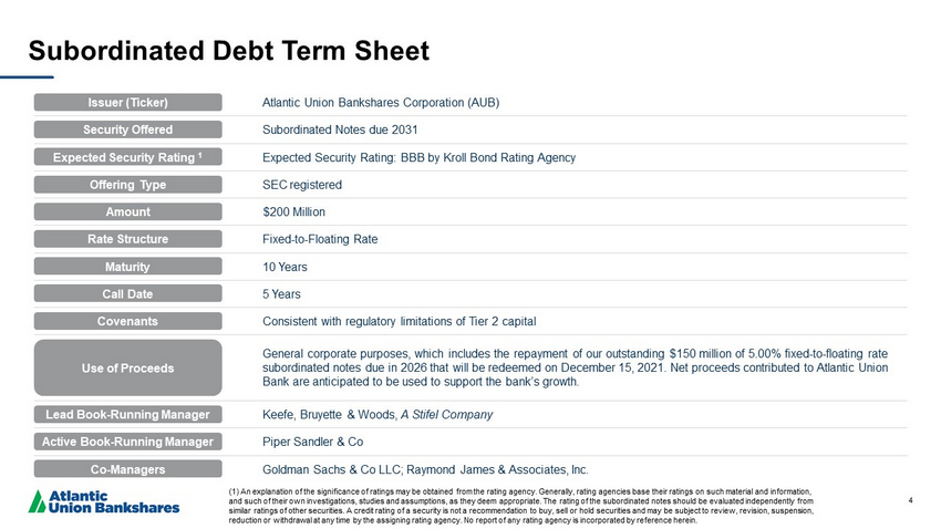 4 Subordinated Debt Term Sheet (1) An explanation of the significance of ratings may be obtained from the rating agency. Generally, rating agencies base their rati ngs on such material and information, and such of their own investigations, studies and assumptions, as they deem appropriate. The rating of the subordinated notes sh ould be evaluated independently from similar ratings of other securities. A credit rating of a security is not a recommendation to buy, sell or hold securities an d m ay be subject to review, revision, suspension, reduction or withdrawal at any time by the assigning rating agency. No report of any rating agency is incorporated by referen ce herein. 4 Issuer (Ticker) Security Offered Expected Security Rating 1 Offering Type Rate Structure Maturity Call Date Covenants Use of Proceeds Co - Managers Atlantic Union Bankshares Corporation ( AUB ) Subordinated Notes due 2031 Expected Security Rating: BBB by Kroll Bond Rating Agency SEC registered Fixed - to - Floating Rate 10 Years 5 Years Consistent with regulatory limitations of Tier 2 capital General corporate purposes, which includes the repayment of our outstanding $150 million of 5.00% fixed - to - floating rate subordinated notes due in 2026 that will be redeemed on December 15, 2021. Net proceeds contributed to Atlantic Union Bank are anticipated to be used to support the bank’s growth. Keefe, Bruyette & Woods, A Stife l Company Amount $200 Million Lead Book - Running Manager Book - Running Manager Piper Sandler & Co Goldman Sachs & Co; Raymond James & Associates, Inc.