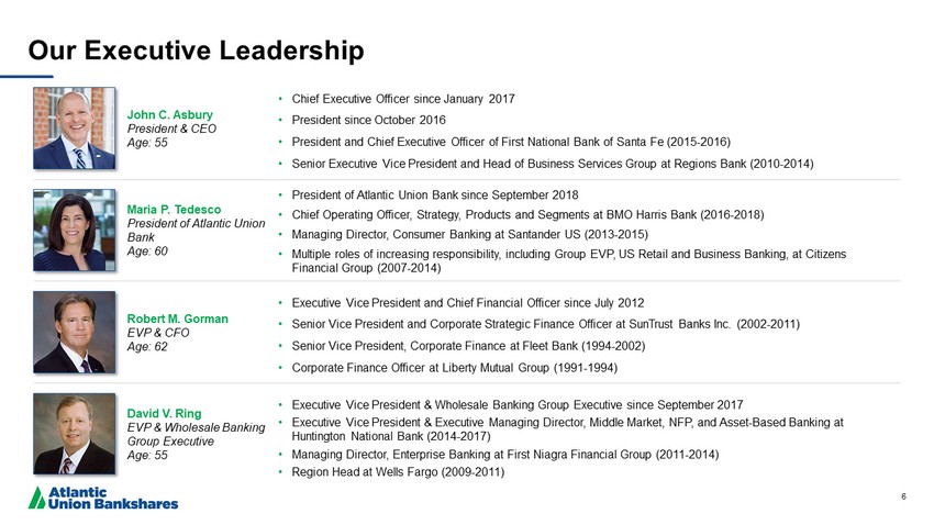 6 • Executive Vice President & Wholesale Banking Group Executive since September 2017 • Executive Vice President & Executive Managing Director, Middle Market, NFP, and Asset - Based Banking at Huntington National Bank (2014 - 2017) • Managing Director, Enterprise Banking at First Niagra Financial Group (2011 - 2014) • Region Head at Wells Fargo (2009 - 2011) David V. Ring EVP & Wholesale Banking Group Executive Age: 55 Our Executive Leadership 6 John C. Asbury President & CEO Age: 55 Maria P . Tedesco President of Atlantic Union Bank Age: 60 Robert M. Gorman EVP & CFO Age: 62 • Chief Executive Officer since January 2017 • President since October 2016 • President and Chief Executive Officer of First National Bank of Santa Fe (2015 - 2016) • Senior Executive Vice President and Head of Business Services Group at Regions Bank (2010 - 2014) • President of Atlantic Union Bank since September 2018 • Chief Operating Officer, Strategy, Products and Segments at BMO Harris Bank (2016 - 2018) • Managing Director, Consumer Banking at Santander US (2013 - 2015) • Multiple roles of increasing responsibility, including Group EVP, US Retail and Business Banking, at Citizens Financial Group (2007 - 2014) • Executive Vice President and Chief Financial Officer since July 2012 • Senior Vice President and Corporate Strategic Finance Officer at SunTrust Banks Inc. (2002 - 2011) • Senior Vice President, Corporate Finance at Fleet Bank (1994 - 2002) • Corporate Finance Officer at Liberty Mutual Group (1991 - 1994)