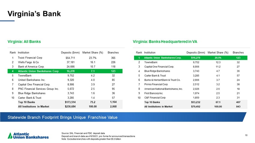 9 Our Markets Source: SNL Financial; excludes branches greater than $5 billion Deposit data as of 6/30/2021; Fredericksburg market defined as Caroline, Fredericksburg City, King George, Spotsylvania and Stafford counties; all other markets per MSA definitions in SNL 9 Richmond State Capital, Fortune 500 headquarters (7), VCU & VCU Medical Center • $4.2 billion in - market deposits and total deposit market share of 11.5% Fredericksburg Defense and security contractors, Healthcare, Retail, Real Estate development • $1.7 billion in - market deposits and total deposit market share of 27.6% Charlottesville University of Virginia, High - tech and professional businesses, Real Estate development • $748 million in - market deposits and total deposit market share of 11.4% Virginia Beach Norfolk Military, Shipbuilding, Fortune 500 headquarters (3), Tourism • $1.6 billion in - market deposits and total deposit market share of 5.1% Roanoke Blacksburg Virginia Tech, Healthcare, Retail • $1.4 billion in - market deposits and total deposit market share of 9.5% Northern Virginia Nation’s Capital, Fortune 500 headquarters (12), Defense and security contractors, Non - profit Associations (lobbyists), HQ2 • $5.7 billion in - market deposits and total deposit market share of 5.5% Diversity Supports Growth In Virginia