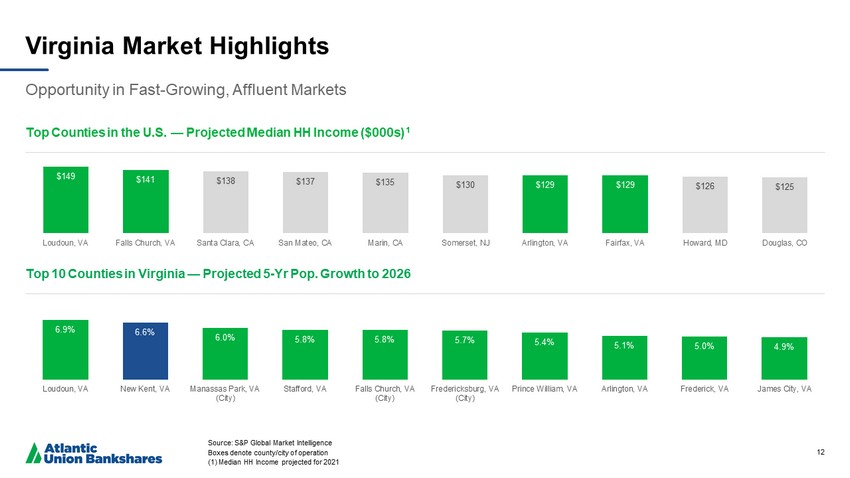 11 Virginia Is Among the Most Attractive Markets in USA Source: SNL Financial; Bureau of Economic Analysis; Bureau of Labor Statistics, Fortune.com , U.S. News & World Report; Forbes, CNBC, U.S. Small Business Administration, USA Today; Business Facilities Unemployment data as of 10/21 (1) CNBC did not publish rankings in 2020 due to the COVID - 19 pandemic ( 2) 2021 household income and population data per SNL Financial as of 11/26/21 (3) Real GDP data per Bureau of Economic Analysis for the year 2020 (4) For the year 2020 11 ranked Virginia the Best State for Business two times in a row 1 ranked Virginia the 4 th Best State for Business • 3 rd in Labor Supply • 3 rd in Regulatory Environment • 1 st in Quality of Life ranked Virginia 8 th for Opportunity • 11 th for Economic opportunity • 5 th for Equality • 12 th for Education • Virginia is home to 723,962 Small Businesses – 99.5% of Virginia businesses ranked Virginia 7 th of America’s Best States to Live In Virginia rated 1 st in Best Business Climate, Tech Talent Pipeline, Cybersecurity # State # Companies 1 New York 54 2 California 53 3 Texas 50 4 Illinois 37 5 Ohio 27 6 Virginia 22 7 Pennsylvania 22 8 Florida 18 # State Pop. (mm) 1 California 39.7 2 Texas 29.6 3 Florida 21.9 4 New York 19.4 5 Pennsylvania 12.8 6 Illinois 12.6 7 Ohio 11.7 8 Georgia 10.8 # State HHI ($) 1 District of Columbia 91,414 2 Maryland 90,160 3 New Jersey 89,080 4 Hawaii 87,979 5 Massachusetts 87,126 6 California 82,565 7 Connecticut 81,962 8 Washington 81,728 # State GDP ($bn) 1 California 2,664 2 Texas 1,734 3 New York 1,420 4 Florida 944 5 Illinois 738 6 Pennsylvania 684 7 Ohio 590 8 Georgia 537 Household Income ($) 2 2021 Population (mm ) 2 # State Pop. (mm) 9 North Carolina 10.6 10 Michigan 10.0 11 New Jersey 8.9 12 Virginia 8.6 13 Washington 7.8 14 Arizona 7.4 15 Massachusetts 6.9 # State HHI ($) 9 New Hampshire 81,460 10 Alaska 80,135 11 Virginia 79,124 12 Utah 78,645 13 Colorado 78,070 14 Minnesota 76,329 15 New York 74,462 Real GDP ($ bn ) 3 Fortune 500 Companies 4 # State # Companies 9 Georgia 18 10 New Jersey 17 11 Michigan 17 12 Massachusetts 17 13 Minnesota 16 14 Connecticut 13 15 Tennessee 10 # State GDP ($bn) 9 New Jersey 536 10 Washington 533 11 North Carolina 500 12 Massachusetts 499 13 Virginia 474 14 Michigan 446 15 Maryland 353