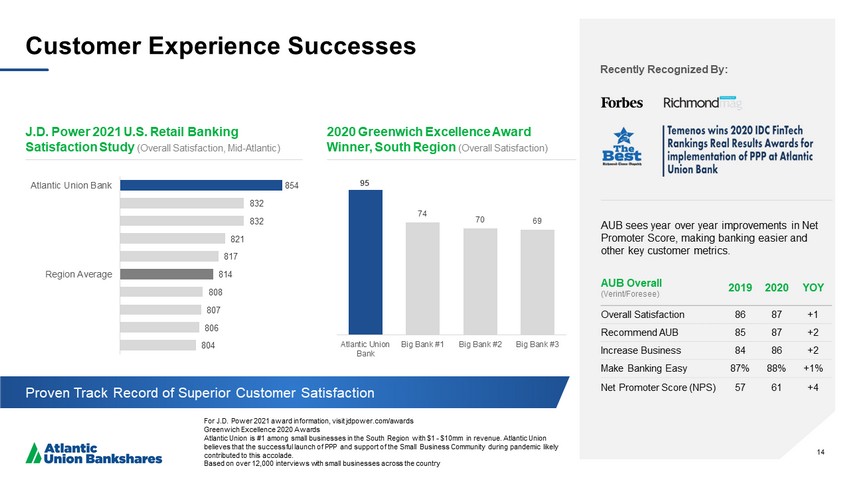 13 Our Presence in Key Markets Source: S&P Global Market Intelligence Note: Deposit data excludes branches with deposits greater than $5 billion Deposit and branch data as of 6/30/21; pro forma for announced transactions (1) Northern Virginia includes only the Virginia branches of the Washington, Alexandria, and DC MSA (2) Coastal Virginia includes the Virginia Beach, Norfolk, and Newport News MSA and the Outer Banks of North Carolina Virginia Richmond Rank Institution Deposits ($mm) Market Share (%) Branches 1 Truist Financial Corp $54,711 23.7% 365 2 Wells Fargo & Co 37,181 16.1 226 3 Bank of America Corp. 24,666 10.7 118 4 Atlantic Union Bankshares Corp 16,278 7.1 123 5 TowneBank 9,752 4.2 32 6 United Bankshares Inc. 9,320 4.0 85 7 Capital One Financial Corp. 8,906 3.9 27 8 PNC Financial Services Group Inc. 5,672 2.5 95 9 Blue Ridge Bankshares 3,743 1.6 36 10 Carter Bank & Trust 3,285 1.4 57 Northern Virginia 1 Coastal Virginia 2 Rank Institution Deposits ($mm) Market Share (%) Branches 1 Truist Financial Corp $23,354 22.7% 125 2 Bank of America Corp. 15,575 15.1 61 3 Wells Fargo & Co. 13,593 13.2 84 4 Capital One Financial Corp. 8,906 8.7 27 5 United Bankshares Inc. 7,118 6.9 47 6 Atlantic Union Bankshares Corp. 5,683 5.5 27 7 PNC Financial Services Group Inc. 4,802 4.7 80 8 Toronto - Dominion Bank 2,998 2.9 22 9 Burke & Herbert Bank & Trust Co. 2,906 2.8 24 10 Citigroup Inc. 1,840 1.8 6 Rank Institution Deposits ($mm) Market Share (%) Branches 1 Truist Financial Corp. $12,728 34.9% 58 2 Wells Fargo & Co. 8,744 24.0 51 3 Atlantic Union Bankshares Corp. 4,183 11.5 26 4 Bank of America Corp. 2,726 7.5 20 5 TowneBank 1,341 3.7 8 6 C&F Financial Corp. 1,202 3.3 15 7 Primis Financial Corp. 832 2.3 12 8 United Bankshares Inc. 821 2.3 12 9 Village Bank and Trust Financial Corp. 627 1.7 8 10 Blue Ridge Bankshares Inc. 536 1.5 7 Rank Institution Deposits ($mm) Market Share (%) Branches 1 TowneBank $8,663 27.1% 27 2 Truist Financial Corp. 6,285 19.7 58 3 Wells Fargo & Co. 6,180 19.3 36 4 Bank of America Corp. 4,164 13.0 27 5 Atlantic Union Bankshares Corp. 1,629 5.1 17 6 Old Point Financial Corp. 1,135 3.6 19 7 Southern BancShares (N.C.) Inc. 747 2.3 11 8 Chesapeake Financial Shares Inc. 678 2.1 8 9 The PNC Financial Services Group Inc. 546 1.7 11 10 Farmers Bankshares Inc. 500 1.6 8