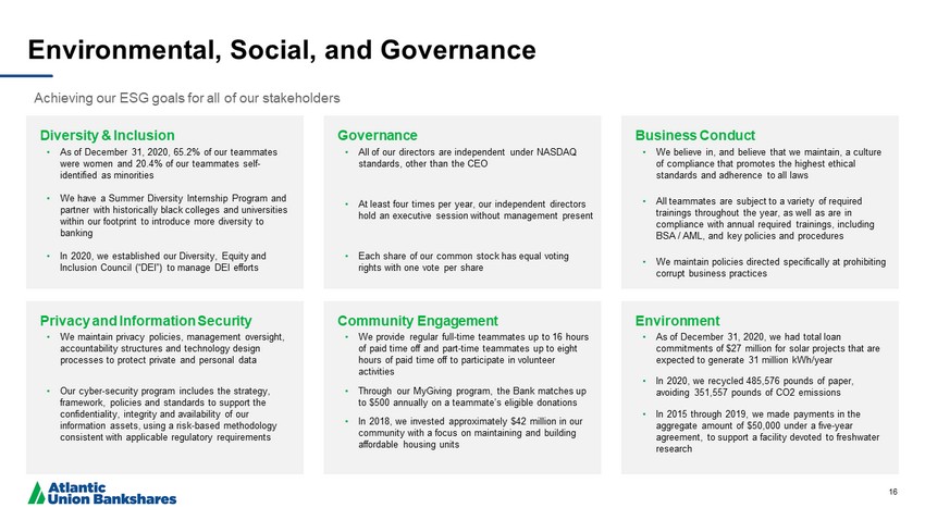 15 Caring Working together toward common goals, acting with kindness, respect and a genuine concern for others. Courageous Speaking openly, honestly and accepting our challenges and mistakes as opportunities to learn and grow. Committed Driven to help our clients, Teammates and company succeed, doing what is right and accountable for our actions. Our Core Values Culture — HOW we come together and interact as a team to accomplish our business and societal goals. Diversity, Equity, and Inclusion Statement Atlantic Union Bank embraces diversity of thought and identity to better serve our stakeholders and achieve our purpose. We commit to cultivating a welcoming workplace where Teammate and customer perspectives are valued and respected.