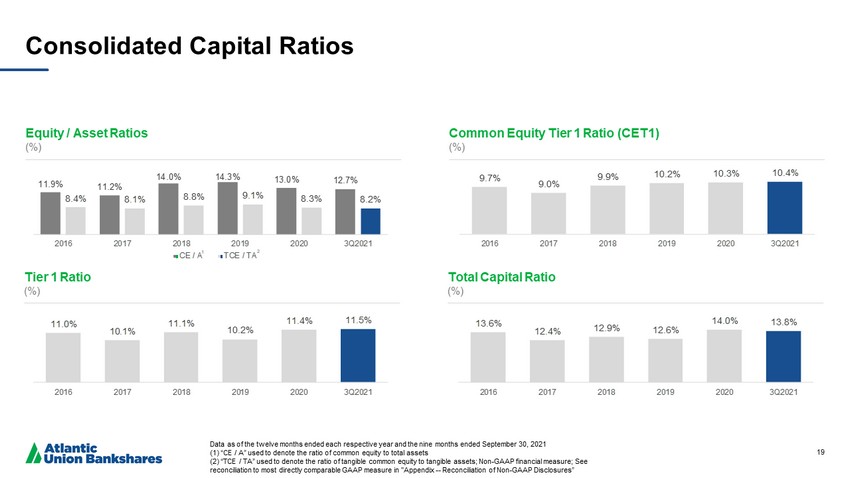 18 Balance Sheet Trends Data as of or for the twelve months ended each respective year and the nine months ended September 30, 2021 Loans ($mm) Deposits ($mm) Assets ($mm) $6,307 $7,142 $9,716 $12,611 $14,021 $13,140 2016 2017 2018 2019 2020 3Q2021 16% CAGR $6,379 $6,992 $9,971 $13,305 $15,723 $16,622 2016 2017 2018 2019 2020 3Q2021 21% CAGR $8,427 $9,315 $13,766 $17,563 $19,628 $19,936 2016 2017 2018 2019 2020 3Q2021 19% CAGR