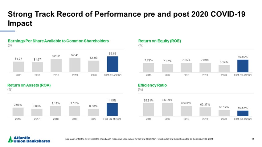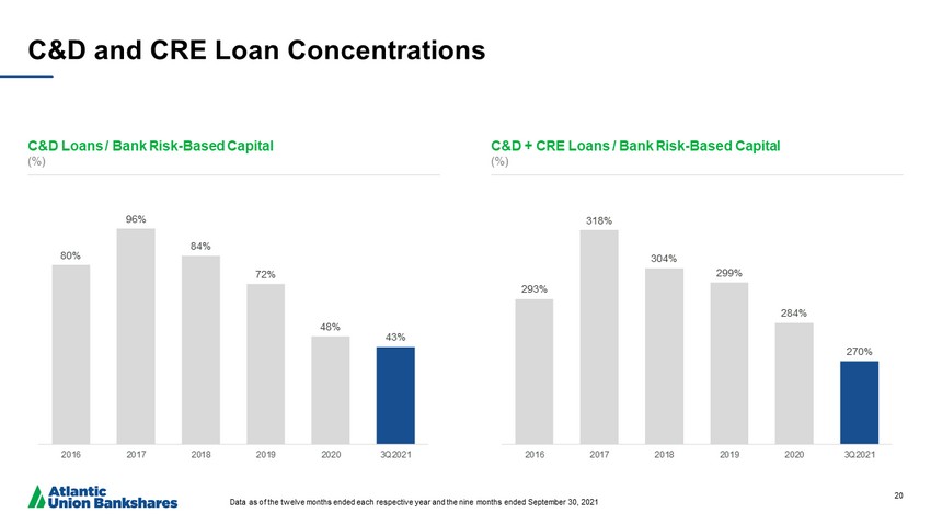 20 80% 96% 84% 72% 48% 43% 2016 2017 2018 2019 2020 3Q2021 C&D and CRE Loan Concentrations Data as of the twelve months ended each respective year and the nine months ended September 30, 2021 C&D Loans / Bank Risk - Based Capital (%) C&D + CRE Loans / Bank Risk - Based Capital (%) 293% 318% 304% 299% 284% 270% 2016 2017 2018 2019 2020 3Q2021