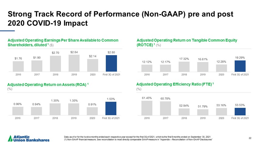 21 Strong Track Record of Performance pre and post 2020 COVID - 19 Impact Data as of or for the twelve months ended each respective year except for the first 3Q of 2021, which is the first 9 months e nde d on September 30, 2021 Earnings Per Share Available to Common Shareholders ($) Return on Equity (ROE) (%) Return on Assets (ROA) (%) Efficiency Ratio (%) $1.77 $1.67 $2.22 $2.41 $1.93 $2.66 2016 2017 2018 2019 2020 First 3Q of 2021 7.79% 7.07% 7.85% 7.89% 6.14% 10.59% 2016 2017 2018 2019 2020 First 3Q of 2021 65.81% 66.09% 63.62% 62.37% 60.19% 59.57% 2016 2017 2018 2019 2020 First 3Q of 2021 0.96% 0.83% 1.11% 1.15% 0.83% 1.45% 2016 2017 2018 2019 2020 First 3Q of 2021