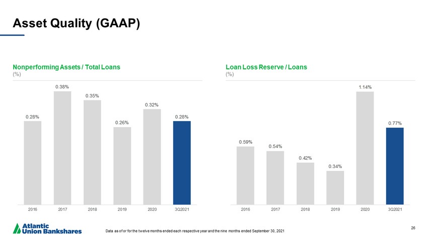 25 Q3 Allowance For Credit Loss (ACL) and Provision for Credit Losses Note: Figures may not foot due to rounding (1) Non - GAAP financial measure; See reconciliation to most directly comparable GAAP measure in "Appendix -- Reconciliation of Non - GAAP Disclosures” 25 Q3 Macroeconomic Forecast Moody’s September Baseline Forecast US GDP averages 6.0% growth in 2021 and 4.3% in 2022. The unemployment rate averages 5.5% in 2021 and 3.6% in 2022. Virginia’s unemployment rate averages 2.7% over the 2 - year forecast, declining to 2.5%; compares to a June forecast of 3.2% average and ending at 2.8%. 2 - year reasonable and supportable period; followed by reversion to the historical loss average over 2 years. Q3 Additional Considerations Additional qualitative factors for COVID - 19 sensitive portfolios and adjustments to account for the probability of worse - than Baseline economic performance. Regulatory Capital: Opted into 2 year CECL adoption capital impact delay with 25% of cumulative Day 2 impact added back to Common Equity Tier 1 capital through 2021. 3 - year regulatory CECL capital phase - in begins in 2022 ($mm) Allowance for Loan & Lease Losses Reserve for Unfunded Commitments Allowance for Credit Losses 1/1/2020 CECL Opening Balance % of loans $90MM 0.71 % $5MM 0.04 % $95MM 0.75 % CECL Adoption through Q2 2021 +$28MM Increase attributable to COVID - 19 induced recession; sizeable increase for COVID - 19 sensitive portfolios +$5MM Increase due to higher expected loss related to COVID - 19 environment +$33MM $33 million build ($46 million provision for credit losses less $13 million net charge - offs) 6/30/2021 Ending Balance % of loans $118MM (0.86%; 0 .92% excl. PPP loans ) 1 $10MM (0.07 %; 0 .08 % excl. PPP loans ) 1 $128MM (0.94 %; 1.00% excl. PPP loans ) 1 Q3 2021 - $16MM Decrease due to improved economic forecast and favorable risk rating migration - $3MM Decrease due to lower expected loss rates, attributable primarily to improved economic outlook. - $19MM $19 million benefit from Provision for Credit Losses and minimal net charge - offs 9/30/2021 Ending Balance % of loans $102MM (0.77 %; 0 .80 % excl. PPP loans ) 1 $7MM (0.06 %; 0 .06 % excl. PPP loans ) 1 $109MM (0.83 %; 0 .86 % excl. PPP loans ) 1