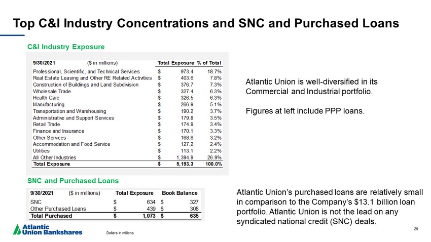 28 Diversified and Granular Loan Portfolio Total Loan Portfolio – $13.1 billion Non - Owner Occupied CRE Composition — $4.5 billion C&D 6.7% Owner Occupied CRE 15.4% C&I 19.6% Non - Owner Occupied CRE 34.3% 1 - 4 Family 11.0% Other 4.1% Residential 1 - 4 family - Revolving 4.2% Consumer 4.6% Retail 18.2% Office 17.2% Office Warehouse 13.3% Multi Family 17.2% Hotel, Motel, B&B 14.2% Senior Living 7.2% Special Use 11.2% Small Mixed Use Building 1.1% Other 0.5% Total Portfolio Characteristics Duration Q3 2021 Weighted Average Yield (Tax Equivalent) 1.09 years 3.70% Data as of or for the three months ended September 30, 2021; Figures may not total to 100% due to rounding