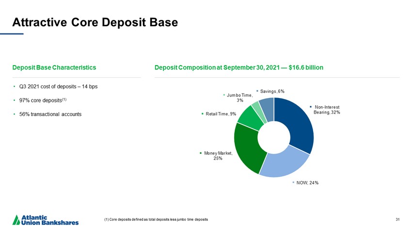 31 Non - Interest Bearing , 32% NOW , 24% Money Market , 25% Retail Time , 9% Jumbo Time , 3% Savings , 6% Attractive Core Deposit Base Deposit Base Characteristics Deposit Composition at September 30, 2021 — $16.6 billion (1) Core deposits defined as total deposits less jumbo time deposits • Q3 2021 cost of deposits – 14 bps • 97% core deposits (1) • 56% transactional accounts