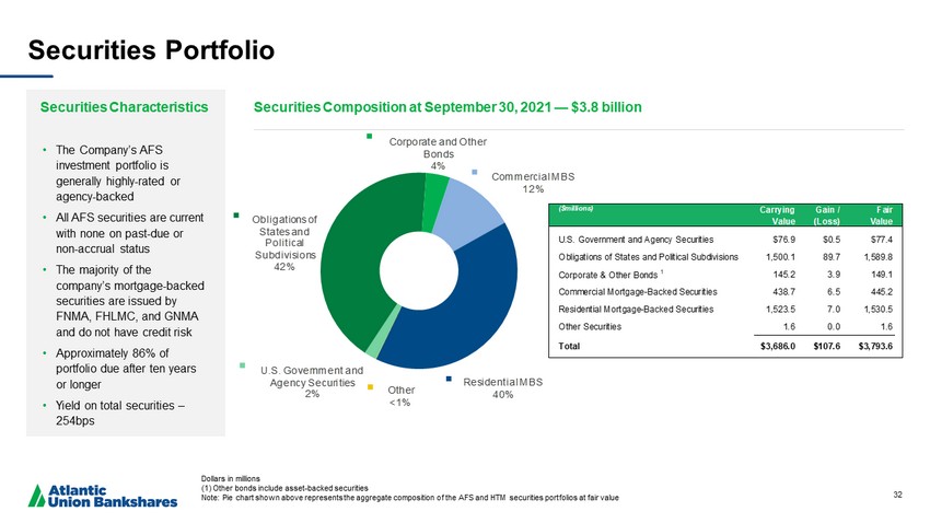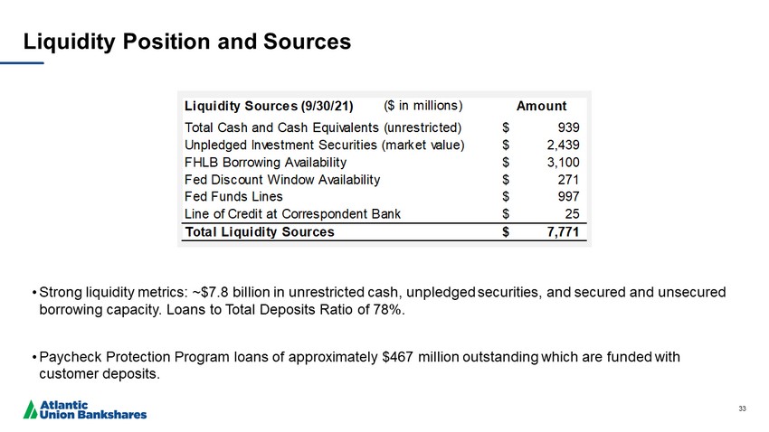 32 ($millions) Carrying Gain / Fair Value (Loss) Value U.S. Government and Agency Securities $76.9 $0.5 $77.4 Obligations of States and Political Subdivisions 1,500.1 89.7 1,589.8 Corporate & Other Bonds 1 145.2 3.9 149.1 Commercial Mortgage-Backed Securities 438.7 6.5 445.2 Residential Mortgage-Backed Securities 1,523.5 7.0 1,530.5 Other Securities 1.6 0.0 1.6 Total $3,686.0 $107.6 $3,793.6 Securities Portfolio Securities Characteristics Securities Composition at September 30, 2021 — $3.8 billion • The Company’s AFS investment portfolio is generally highly - rated or agency - backed • All AFS securities are current with none on past - due or non - accrual status • The majority of the company’s mortgage - backed securities are issued by FNMA, FHLMC, and GNMA and do not have credit risk • Approximately 86% of portfolio due after ten years or longer • Yield on t otal securities – 254bps U.S. Government and Agency Securities 2% Obligations of States and Political Subdivisions 42% Corporate and Other Bonds 4% Commercial MBS 12% Residential MBS 40% Other <1% Dollars in millions (1) Other bonds include asset - backed securities Note: Pie chart shown above represents the aggregate composition of the AFS and HTM securities portfolios at fair value