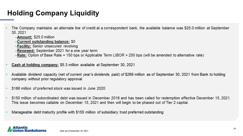 33 Liquidity Position and Sources 1.09 years 3.70% • Strong liquidity metrics: ~$7.8 billion in unrestricted cash, unpledged securities, and secured and unsecured borrowing capacity . Loans to Total Deposits Ratio of 78%. • Paycheck Protection Program loans of approximately $467 million outstanding which are funded with customer deposits. j Liquidity Sources (9/30/21) ($ in millions) Amount Total Cash and Cash Equivalents (unrestricted) 939$ Unpledged Investment Securities (market value) 2,439$ FHLB Borrowing Availability 3,100$ Fed Discount Window Availability 271$ Fed Funds Lines 997$ Line of Credit at Correspondent Bank 25$ Total Liquidity Sources 7,771$