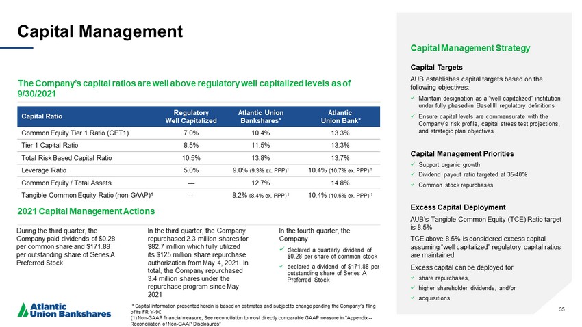 34 34 Holding Company Liquidity • The Company maintains an alternate line of credit at a correspondent bank, the available balance was $25.0 million at Septemb er 30, 2021 ‒ Amount: $25.0 million ‒ Current outstanding balance: $0 ‒ Facility: Senior unsecured revolving ‒ Renewed: September 2021 for a one year term ‒ Rate: Option of Base Rate + 150 bps or Applicable Term LIBOR + 250 bps (will be amended to alternative rate) • Cash at holding company: $5.3 million available at September 30, 2021 • Available dividend capacity (net of current year’s dividends paid) of $ 269 million as of September 30, 2021 from Bank to holding company without prior regulatory approval • $166 million of preferred stock was issued in June 2020 • $150 million of subordinated debt was issued in December 2016 and has been called for redemption effective December 15, 2021. This issue becomes callable on December 15, 2021 and then will begin to be phased out of Tier 2 capital. • Manageable debt maturity profile with $155 million of subsidiary trust preferred outstanding Data as of September 30, 2021