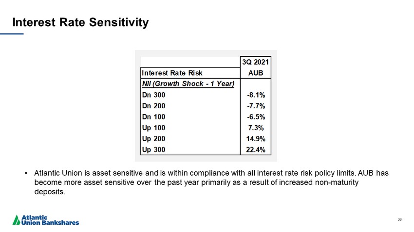 36 36 Interest Rate Sensitivity • Atlantic Union is asset sensitive and is within compliance with all interest rate risk policy limits. AUB has become more asset sensitive over the past year primarily as a result of increased non - maturity deposits. 3Q 2021 Interest Rate Risk AUB NII (Growth Shock - 1 Year) Dn 300 -8.1% Dn 200 -7.7% Dn 100 -6.5% Up 100 7.3% Up 200 14.9% Up 300 22.4%