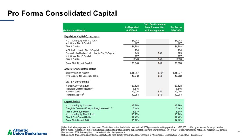 38 Sub. Debt Issuance As Reported Less Redemption Pro Forma (Dollars in millions) 9/30/2021 of Existing Notes 9/30/2021 Regulatory Capital Components Common Equity Tier 1 Capital $1,541 $1,541 Additional Tier 1 Capital 167 167 Tier 1 Capital $1,708 $1,708 ACL Includable in Tier 2 Capital $54 $54 Subordinated Notes Includable in Tier 2 Capital 149 $50 199 Additional Tier 2 Capital 137 137 Tier 2 Capital $340 $50 $390 Total Risk-Based Capital $2,048 $50 $2,098 Assets for Regulatory Ratios Risk-Weighted Assets $14,867 $10 $14,877 Avg. Assets for Leverage Ratio 19,042 $50 19,092 TCE / TA Components Actual Common Equity $2,528 $2,528 Tangible Common Equity 1,546 1,546 Actual Assets 19,936 $50 19,986 Tangible Assets 18,954 $50 19,004 Capital Ratios Common Equity / Assets 12.68% 12.65% Tangible Common Equity / Tangible Assets 8.16% 8.14% Tier 1 Leverage Ratio 8.97% 8.94% Common Equity Tier 1 Ratio 10.37% 10.36% Tier 1 Risk-Based Ratio 11.49% 11.48% Total Risk-Based Ratio 13.78% 14.10% Pro Forma Consolidated Capital (1) For illustrative purposes only, assumes a $200 million subordinated debt raise with a 1.00% gross underwriting spread, and $500,000 in offering expenses, for net proceeds of $ 197.5 million. Additionally, this reflects the redemption at par of an existing subordinated debt note of $ 150 million on 12/15/21, which represents a net capital impact of $50.0 million (2) Assumes a 20% risk weighting on net subordinated debt proceeds. (3) Non - GAAP financial measure; See reconciliation to most directly comparable GAAP measure in "Appendix -- Reconciliation of Non - GAAP Disclo sures” 2 1 3 3 3