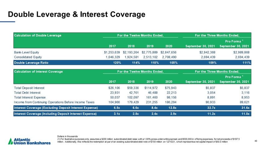 39 Source: KBRA – “Atlantic Union Bankshares Corporation Surveillance Report” published 11/22/21 Note: Ratings last affirmed 11/22/21 Note: An explanation of the significance of ratings may be obtained from the rating agency. Generally, rating agencies base their rati ngs on such material and information, and such of their own investigations, studies and assumptions, as they deem appropriate. The rating of the subordinated notes should be evaluat ed independently from similar ratings of other securities. A credit rating of a security is not a recommendation to buy, sell or hold securities and may be subject to review, revision, s usp ension, reduction or withdrawal at any time by the assigning rating agency. No report of any rating agency is incorporated by reference herein. Kroll Bond Rating Agency Summary Kroll Bond Rating Agency Ratings Summary Outlook Positive Atlantic Union Bankshares Corporation Rating Senior Unsecured Debt BBB+ Subordinated Debt BBB Short-Term Debt K2 Atlantic Union Bank Rating Deposits A- Senior Unsecured Debt A- Subordinated Debt BBB+ Short-Term Deposit K2 Short-Term Debt K2