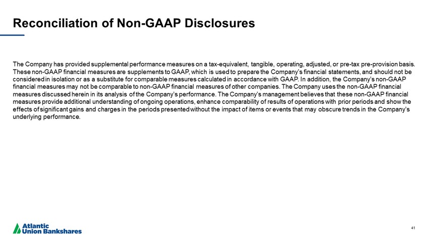 41 Reconciliation of Non - GAAP Disclosures The Company has provided supplemental performance measures on a tax - equivalent, tangible, operating, adjusted, or pre - tax pre - pr ovision basis. These non - GAAP financial measures are supplements to GAAP, which is used to prepare the Company’s financial statements, and shou ld not be considered in isolation or as a substitute for comparable measures calculated in accordance with GAAP. In addition, the Compa ny’ s non - GAAP financial measures may not be comparable to non - GAAP financial measures of other companies. The Company uses the non - GAAP financ ial measures discussed herein in its analysis of the Company’s performance. The Company’s management believes that these non - GAAP fi nancial measures provide additional understanding of ongoing operations, enhance comparability of results of operations with prior pe rio ds and show the effects of significant gains and charges in the periods presented without the impact of items or events that may obscure tren ds in the Company’s underlying performance.