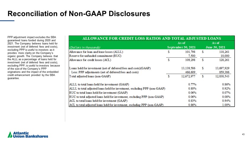 42 Reconciliation of Non - GAAP Disclosures Adjusted operating measures exclude the after - tax effect of merger and rebranding - related costs unrelated to the Company’s normal operations. In addition, adjusted operating measures exclude the gains or losses related to balance sheet repositioning (principally composed of gains and losses on debt extinguishment) and gains or losses on sale of securities. The Company believes these non - GAAP adjusted measures provide investors with important information about the combined economic results of the organization’s operations Additionally, the Company believes that return on tangible common equity (ROTCE) is a meaningful supplement to GAAP financial measures and useful to investors because it measures the performance of a business consistently across time without regard to whether components of the business were acquired or developed internally. (1) Includes expenses related to PPP loan forgiveness and PPP round two loan set - up, expenses incurred related to the Company’s response to COVID - 19, gains on the sale of closed branches, costs related to the Company’s closure of branches, merger - related costs, rebranding expenses, severance expenses, and losses on debt extinguishment (2) Includes unrealized losses related to SBIC Investment due to COVID - 19, insurance proceeds, gains related to the sale of Shor e Premier, and gains related to the sale of the Company’s ownership interest in a payments - related company ADJUSTED OPERATING EARNINGS & FINANCIAL METRICS For the three months For the nine months ended ended For the years ended (Dollars in thousands, except per share amounts) September 30, 2021 September 30, 2021 2020 2019 2018 2017 2016 Net Income Net income (GAAP) 74,565$ 216,138$ 158,228$ 193,528$ 146,248$ 72,923$ 77,476$ Plus: Merger and rebranding-related costs net of tax - - - 27,395 32,065 4,405 - Plus: Nonrecurring tax expenses - - - - - 6,250 - Plus: Net loss related to balance sheet repositioning, net of tax - 11,609 25,979 12,953 - - - Less: Gain on sale of securities, net of tax 7 69 9,712 6,063 303 520 133 Adjusted operating earnings (non-GAAP) 74,558$ 227,678$ 174,495$ 227,813$ 178,010$ 83,058$ 77,343$ Less: Dividends on preferred stock 2,967 8,901 5,658 - - - - Adjusted operating earnings available to common shareholders (non-GAAP) 71,591$ 218,777$ 168,837$ 227,813$ 178,010$ 83,058$ 77,343$ Earnings per share (EPS) Weighted average common shares outstanding, diluted 76,322,736 78,007,543 78,875,668 80,263,557 65,908,573 43,779,744 43,890,271 EPS available to common shareholders, diluted (GAAP) 0.94$ 2.66$ 1.93$ 2.41$ 2.22$ 1.67$ 1.77$ Adjusted operating EPS available to common shareholders, diluted (non-GAAP) 0.94$ 2.80$ 2.14$ 2.84$ 2.70$ 1.90$ 1.76$ Return on assets (ROA) Average Assets 20,056,570$ 19,890,155$ 19,083,853$ 16,840,310$ 13,181,609$ 8,820,142$ 8,046,305$ ROA (GAAP) 1.47% 1.45% 0.83% 1.15% 1.11% 0.83% 0.96% Adjusted operating ROA (non-GAAP) 1.47% 1.53% 0.91% 1.35% 1.35% 0.94% 0.96% Return on equity (ROE) Adjusted operating earnings available to common shareholders (non-GAAP) 71,591$ 218,777$ 168,837$ 227,813$ 178,010$ 83,058$ 77,343$ Plus: Amortization of intangibles, tax effected 2,671 8,436 13,093 14,632 10,143 3,957 4,687 Adjusted operating earnings available to common shareholders before amortization of intangibles (non-GAAP) 74,262$ 227,213$ 181,930$ 242,445$ 188,153$ 87,015$ 82,030$ Average equity (GAAP) 2,718,032$ 2,728,605$ 2,576,372$ 2,451,435$ 1,863,216$ 1,030,847$ 994,785$ Less: Average intangible assets 983,739 987,288 1,000,654 991,926 776,944 315,722 318,131 Less: Average perpetual preferred stock 166,356 166,356 93,658 - - - - Average tangible common equity (non-GAAP) 1,567,937$ 1,574,961$ 1,482,060$ 1,459,509$ 1,086,272$ 715,125$ 676,654$ ROE (GAAP) 10.88% 10.59% 6.14% 7.89% 7.85% 7.07% 7.79% Return on tangible common equity (ROTCE) Net income available to common shareholders (GAAP) 71,598$ 207,237$ 152,570$ 193,528$ 146,248$ 72,923$ 77,476$ Plus: Amortization of intangibles, tax effected 2,671 8,436 13,093 14,632 10,143 3,957 4,687 Net income available to common shareholders before amortization of intangibles (non- GAAP) 74,269$ 215,673$ 165,663$ 208,160$ 156,391$ 76,880$ 82,163$ ROTCE 18.79% 18.31% 11.18% 14.26% 14.40% 10.75% 12.14% Adjusted operating ROTCE (non-GAAP) 18.79% 19.29% 12.28% 16.61% 17.32% 12.17% 12.12%