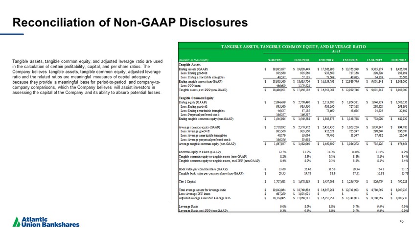 44 Reconciliation of Non - GAAP Disclosures The adjusted operating efficiency ratio (FTE) excludes the amortization of intangible assets, merger and rebranding - related costs, the gain on sale of securities, and gains or losses related to balance sheet repositioning (principally composed of gains and losses on debt extinguishment). This measure is similar to the measure utilized by the Company when analyzing corporate performance and is also similar to the measure utilized for incentive compensation. The Company believes this adjusted measure provides investors with important information about the combined economic results of the organization’s operations. For the nine months ended (Dollars in thousands) September 30, 2021 2020 2019 2018 2017 2016 Noninterest expense (GAAP) 299,251$ 413,349$ 418,340$ 337,767$ 225,668$ 213,090$ Less: Merger-related costs - - 27,824 39,728 5,393 - Less: Rebranding costs - - 6,455 - - - Less: Amortization of intangible assets 10,679 16,574 18,521 12,839 6,088 7,210 Less: Losses related to balance sheet repositioning 14,695 31,116 16,397 - - - Adjusted operating noninterest expense (non-GAAP) 273,877$ 365,659$ 349,143$ 285,200$ 214,187$ 205,880$ Net interest income (GAAP) 412,934$ 555,298$ 537,872$ 426,691$ 279,007$ 263,966$ Net interest income (FTE) (non-GAAP) 422,295 566,845 548,993 434,886 290,774 275,394 Noninterest income (GAAP) 89,388$ 131,486$ 132,815$ 104,241$ 62,429$ 59,849$ Plus: Losses related to balance sheet repositioning - (1,769) - - - - Less: Gain on sale of securities 87 12,294 7,675 383 800 205 Adjusted operating noninterest income (non-GAAP) 89,301$ 120,961$ 125,140$ 103,858$ 61,629$ 59,644$ Efficiency ratio (GAAP) 59.57% 60.19% 62.37% 63.62% 66.09% 65.81% Adjusted operating efficiency ratio (FTE) (non-GAAP) 53.53% 53.16% 51.79% 52.94% 60.78% 61.45% ADJUSTED OPERATING EFFICIENCY RATIO For the years ended December 31,
