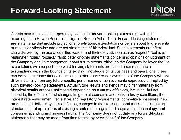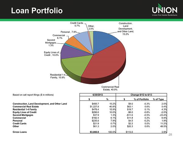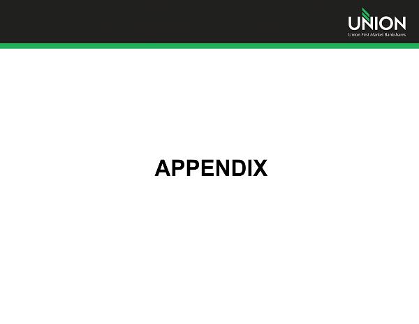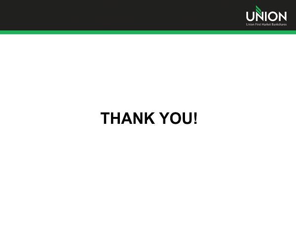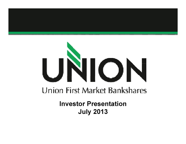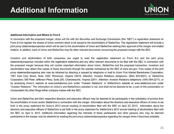 Additional Information Additional Information and Where to Find It In connection with the proposed merger, Union will file with the Securities and Exchange Commission (the “SEC”) a registration statement on Form S - 4 to register the shares of Union common stock to be issued to the stockholders of StellarOne . The registration statement will include a joint proxy statement/prospectus which will be sent to the stockholders of Union and StellarOne seeking their approval of the merger and related matters . In addition, each of Union and StellarOne may file other relevant documents concerning the proposed merger with the SEC . Investors and stockholders of both companies are urged to read the registration statement on Form S - 4 and the joint proxy statement/prospectus included within the registration statement and any other relevant documents to be filed with the SEC in connection with the proposed merger because they will contain important information about Union, StellarOne and the proposed transaction . Investors and stockholders may obtain free copies of these documents through the website maintained by the SEC at www . sec . gov . Free copies of the joint proxy statement/prospectus also may be obtained by directing a request by telephone or mail to Union First Market Bankshares Corporation, 1051 East Cary Street, Suite 1200 , Richmond, Virginia 23219 , Attention : Investor Relations (telephone : ( 804 ) 633 - 5031 ), or StellarOne Corporation, 590 Peter Jefferson Pkwy, Suite 250 , Charlottesville, Virginia 22911 , Attention : Investor Relations (telephone : ( 434 ) 964 - 2217 ), or by accessing Union’s website at www . bankatunion . com under “Investor Relations” or StellarOne’s website at www . stellarone . com under “Investor Relations . ” The information on Union’s and StellarOne’s websites is not, and shall not be deemed to be, a part of this presentation or incorporated into other filings either company makes with the SEC . Union and StellarOne and their respective directors and executive officers may be deemed to be participants in the solicitation of proxies from the stockholders of Union and/or StellarOne in connection with the merger . Information about the directors and executive officers of Union is set forth in the proxy statement for Union’s 2013 annual meeting of stockholders filed with the SEC on April 23 , 2013 . Information about the directors and executive officers of StellarOne is set forth in the proxy statement for StellarOne’s 2013 annual meeting of stockholders filed with the SEC on April 9 , 2013 . Additional information regarding the interests of these participants and other persons who may be deemed participants in the merger may be obtained by reading the joint proxy statement/prospectus regarding the merger when it becomes available . 26