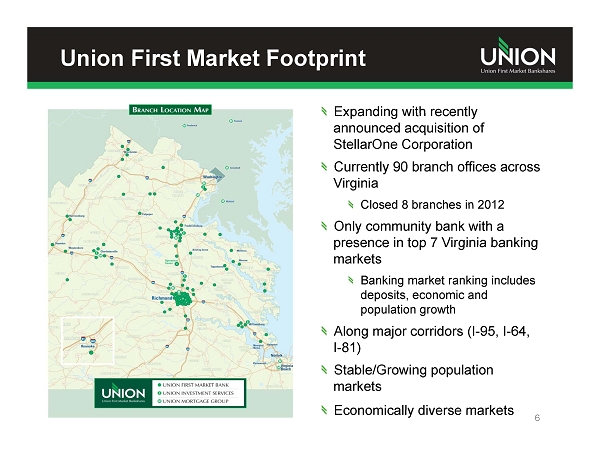 Union First Market’s Strengths Excellent branch network, competitive banking products and services and a loyal client base Well positioned for organic growth given commercial activity, household income levels and population growth in its footprint Strong balance sheet and solid capital base Conservative lender with improving asset quality metrics Experienced management team Successful acquirer and integrator Proven financial performance in both good and bad economic climates 5