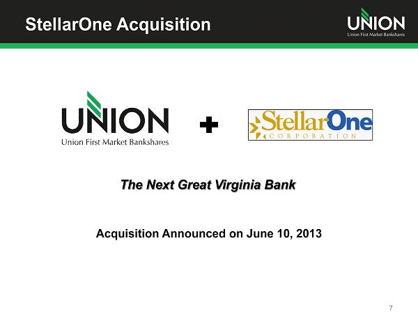 Union First Market Footprint 6 Expanding with recently announced acquisition of StellarOne Corporation Currently 90 branch offices across Virginia Closed 8 branches in 2012 Only community bank with a presence in top 7 Virginia banking markets Banking market ranking includes deposits, economic and population growth Along major corridors (I - 95, I - 64, I - 81) Stable/Growing population markets Economically diverse markets