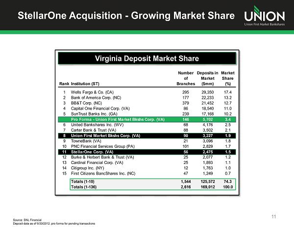StellarOne Acquisition - Competitive Positioning 10 Richmond Charlottesville Source: SNL Financial and U.S. Census Bureau; Deposit data as of 6/30/2012 Note: Small businesses have less than 100 employees; Fredericksburg market defined as Caroline, Fredericksburg City, King Geo rge , Spotsylvania, & Stafford counties; all other markets per MSA definitions in SNL Financial Staunton / Harrisonburg Population: Households: Small Businesses: Market Deposits ($mm): UBSH Branches: Deposits ($mm): Pro Forma 42 4 46 $1,551 $44 $1,595 1,285,296 498,695 29,814 $73,641 STEL Population: Households: Small Businesses: Market Deposits ($mm): UBSH Branches: Deposits ($mm): Pro Forma 7 3 10 $330 $89 $419 205,406 80,055 5,449 $3,610 STEL Population: Households: Small Businesses: Market Deposits ($mm): UBSH Branches: Deposits ($mm): Pro Forma 4 10 14 $51 $437 $488 246,985 94,146 5,583 $3,368 STEL Market Rank: 5 27 5 Market Rank: 6 8 5 Roanoke Population: Households: Small Businesses: Market Deposits ($mm): UBSH Branches: Deposits ($mm): Pro Forma 1 10 11 $16 $339 $355 311,468 129,484 7,864 $7,148 STEL Market Rank: 15 6 6 Blacksburg Population: Households: Small Businesses: Market Deposits ($mm): UBSH Branches: Deposits ($mm): Pro Forma - 9 9 - $696 $696 165,000 64,572 3,135 $2,665 STEL Market Rank: - 1 1 Market Rank: 14 2 2 Fredericksburg Population: Households: Small Businesses: Market Deposits ($mm): UBSH Branches: Deposits ($mm): Pro Forma 14 5 19 $664 $156 $820 332,897 114,196 6,326 $3,449 STEL Market Rank: 3 10 2 Deepening Expanding