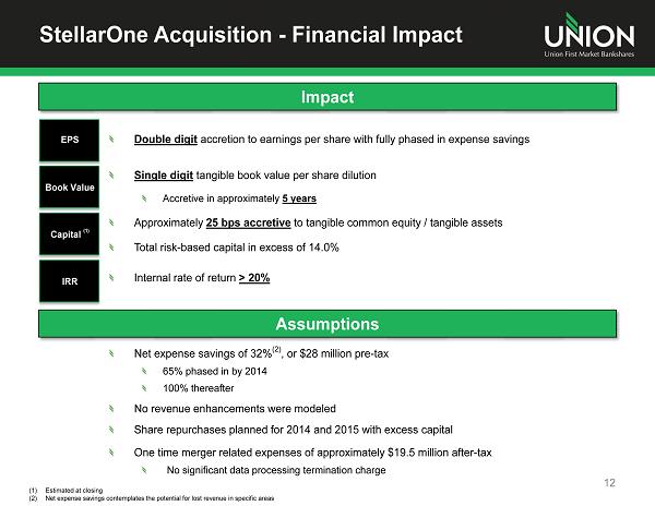 RankInstitution (ST) Number of Branches Deposits in Market ($mm) Market Share (%) 1 Wells Fargo & Co. (CA) 295 29,350 17.4 2 Bank of America Corp. (NC) 177 22,233 13.2 3 BB&T Corp. (NC) 379 21,452 12.7 4 Capital One Financial Corp. (VA) 86 18,540 11.0 5 SunTrust Banks Inc. (GA) 239 17,168 10.2 Pro Forma - Union First Market Bkshs Corp. (VA) 146 5,702 3.4 6 United Bankshares Inc. (WV) 68 4,176 2.5 7 Carter Bank & Trust (VA) 88 3,502 2.1 8 Union First Market Bkshs Corp. (VA) 90 3,227 1.9 9 TowneBank (VA) 21 3,096 1.8 10 PNC Financial Services Group (PA) 101 2,829 1.7 11 StellarOne Corp. (VA) 56 2,475 1.5 12 Burke & Herbert Bank & Trust (VA) 25 2,077 1.2 13 Cardinal Financial Corp. (VA) 25 1,893 1.1 14 Citigroup Inc. (NY) 12 1,763 1.0 15 First Citizens BancShares Inc. (NC) 47 1,249 0.7 Totals (1-10) 1,544 125,572 74.3 Totals (1-136) 2,616 169,012 100.0 StellarOne Acquisition - Growing Market Share 11 Virginia Deposit Market Share Source: SNL Financial Deposit data as of 6/30/2012; pro forma for pending transactions