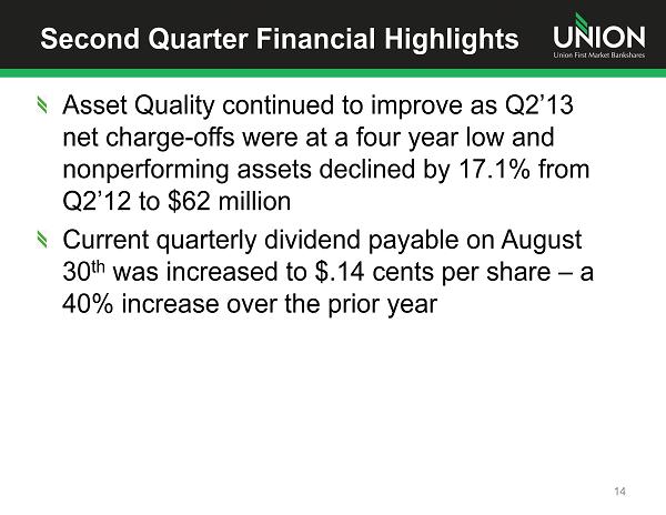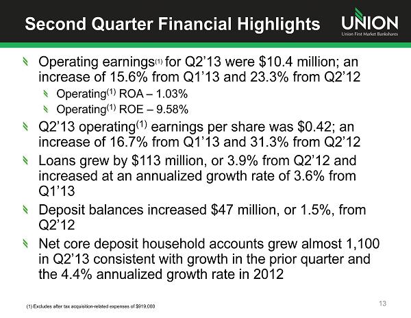 Second Quarter Financial Highlights Operating earnings (1) for Q2’13 were $10.4 million; an increase of 15.6% from Q1’13 and 23.3% from Q2’12 Operating (1) ROA – 1.03% Operating (1) ROE – 9.58% Q2’13 operating (1) earnings per share was $0.42; an increase of 16.7% from Q1’13 and 31.3% from Q2’12 Loans grew by $113 million, or 3.9% from Q2’12 and increased at an annualized growth rate of 3.6% from Q1’13 Deposit balances increased $47 million, or 1.5%, from Q2’12 Net core deposit household accounts grew almost 1,100 in Q2’13 consistent with growth in the prior quarter and the 4.4% annualized growth rate in 2012 13 (1) Excludes after tax acquisition - related expenses of $919,000