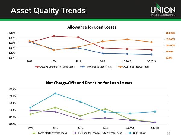 $0 $500,000 $1,000,000 $1,500,000 $2,000,000 $2,500,000 $3,000,000 $3,500,000 $4,000,000 $4,500,000 2009 2010 2011 2012 2Q 2013 $ 2,587 $ 3,837 $ 3,907 $ 4,096 $ 4,057 Balance Sheet Performance 15 Assets ($M) Deposits ($M) Loans ($M) $0 $500,000 $1,000,000 $1,500,000 $2,000,000 $2,500,000 $3,000,000 $3,500,000 2009 2010 2011 2012 2Q 2013 $ 1,874 $ 2,837 $ 2,819 $ 2,967 $ 3,001 $0 $500,000 $1,000,000 $1,500,000 $2,000,000 $2,500,000 $3,000,000 $3,500,000 2009 2010 2011 2012 2Q 2013 $ 1,916 $ 3,070 $ 3,175 $ 3,298 $ 3,266 Nonperforming Assets ($M) $0.0 $10.0 $20.0 $30.0 $40.0 $50.0 $60.0 $70.0 $80.0 $90.0 $100.0 2009 2010 2011 2012 Q2 2013 $22.3 $61.6 $44.8 $26.2 $27.0 $22.5 $36.2 $32.3 $32.8 $35.2 OREO NPLs