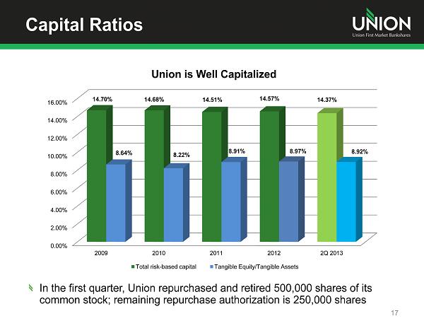 Asset Quality Trends 16 0.00% 50.00% 100.00% 150.00% 200.00% 1.00% 1.20% 1.40% 1.60% 1.80% 2.00% 2009 2010 2011 2012 1Q 2013 2Q 2013 Allowance for Loan Losses ALLL Adjusted for Acquired Loans Allowance to Loans (ALLL) ALLL to Nonaccrual Loans 0.00% 0.50% 1.00% 1.50% 2.00% 2.50% 2009 2010 2011 2012 1Q 2013 2Q 2013 Net Charge - Offs and Provision for Loan Losses Charge - offs to Average Loans Provision for Loan Losses to Average Loans NPLs to Loans