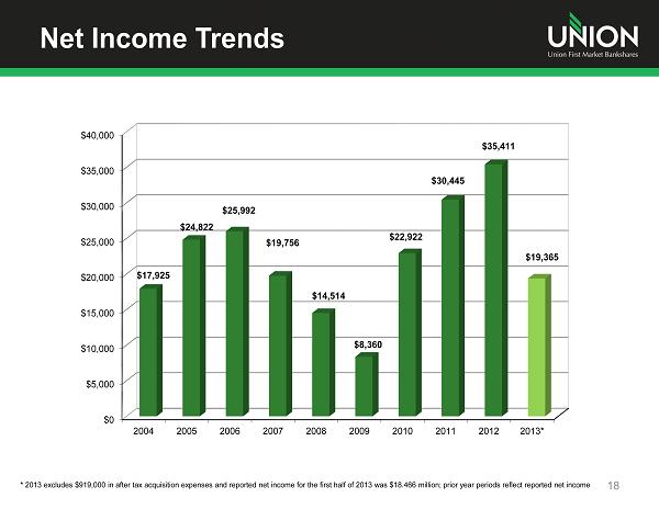 Capital Ratios 17 In the first quarter, Union repurchased and retired 500,000 shares of its common stock; remaining repurchase authorization is 250,000 shares 0.00% 2.00% 4.00% 6.00% 8.00% 10.00% 12.00% 14.00% 16.00% 2009 2010 2011 2012 2Q 2013 14.70% 14.68% 14.51% 14.57% 14.37% 8.64% 8.22% 8.91% 8.97% 8.92% Union is Well Capitalized Total risk - based capital Tangible Equity/Tangible Assets