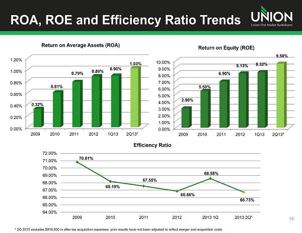 Net Income Trends 18 $0 $5,000 $10,000 $15,000 $20,000 $25,000 $30,000 $35,000 $40,000 2004 2005 2006 2007 2008 2009 2010 2011 2012 2013* $17,925 $24,822 $25,992 $19,756 $14,514 $8,360 $22,922 $30,445 $35,411 $19,365 * 2013 excludes $919,000 in after tax acquisition expenses and reported net income for the first half of 2013 was $18.466 milli on ; prior year periods reflect reported net income