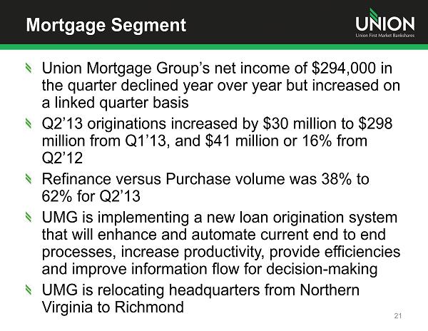 Mortgage Segment Union Mortgage Group’s net income of $294,000 in the quarter declined year over year but increased on a linked quarter basis Q2’13 originations increased by $30 million to $298 million from Q1’13, and $41 million or 16% from Q2’12 Refinance versus Purchase volume was 38% to 62% for Q2’13 UMG is implementing a new loan origination system that will enhance and automate current end to end processes, increase productivity, provide efficiencies and improve information flow for decision - making UMG is relocating headquarters from Northern Virginia to Richmond 21